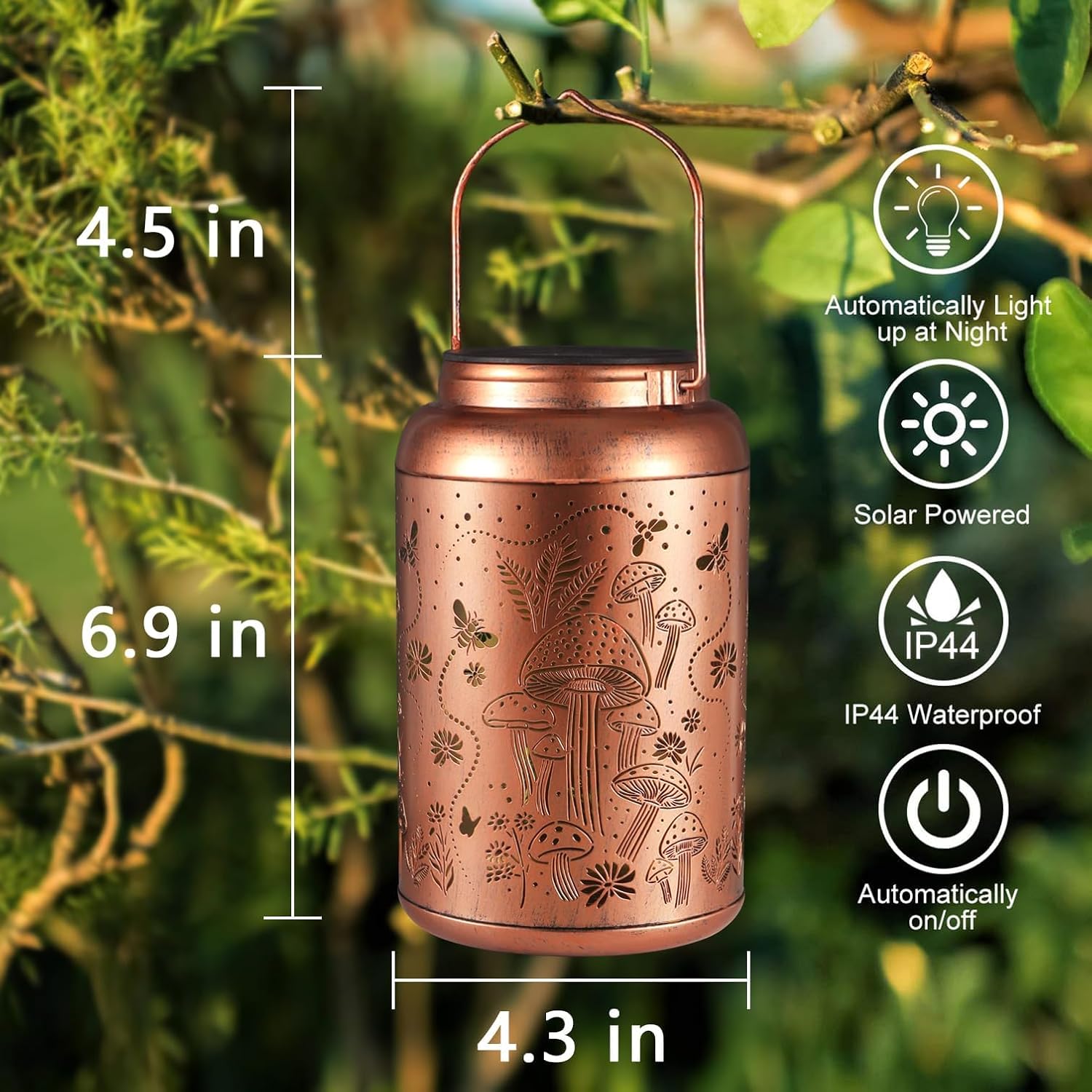 • Graceful Decorative Design:The retro appearance, with gold copper color and hollow out metal veneer, the solar outdoor lanterns casts bright and warm light in darkness, accompanied by gorgeous and graceful Mushroom patterns, adding a beautiful atmosphere to the surrounding environment.