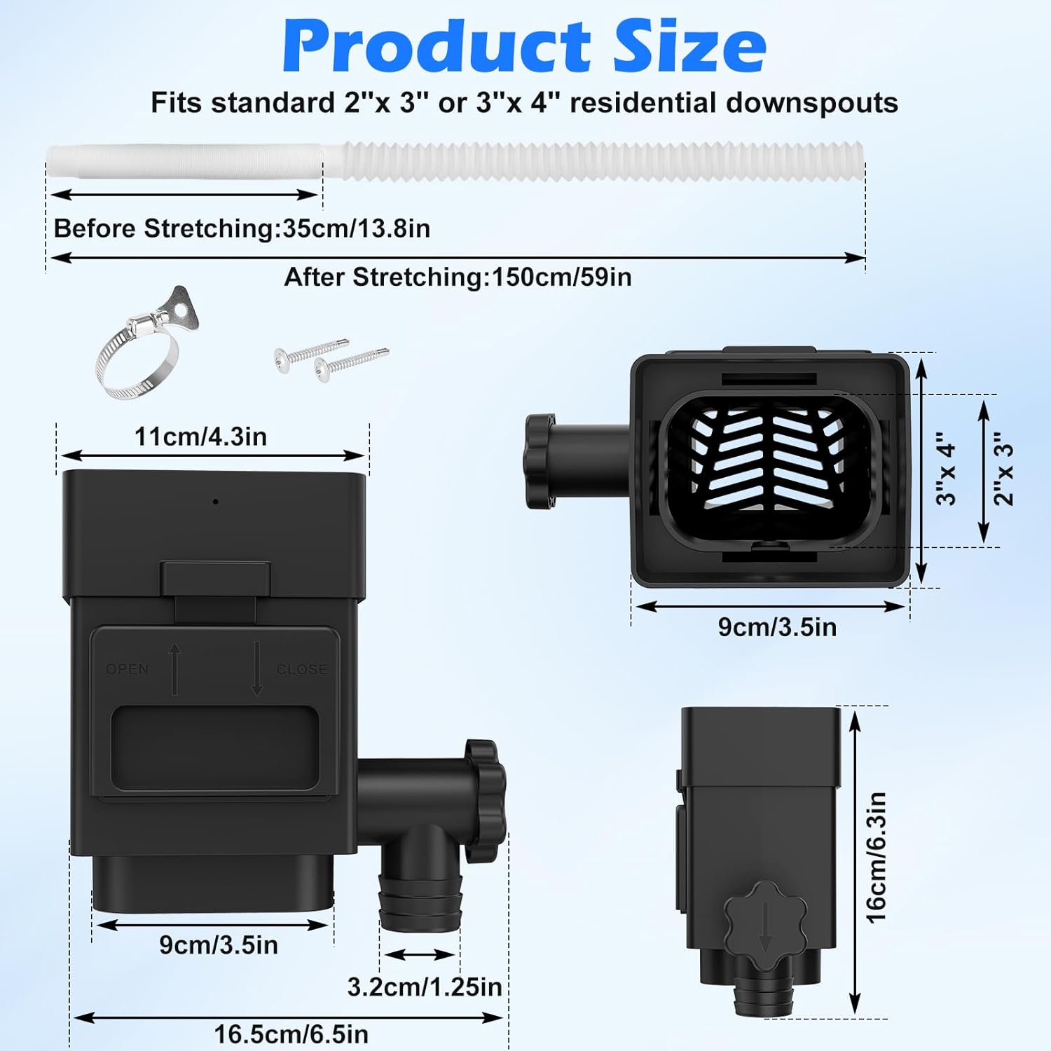 • Compatibility: Fits standard 2"x 3" or 3"x 4" residential downspouts. Please install the rain water catching system 18 inches above the rain barrel.
