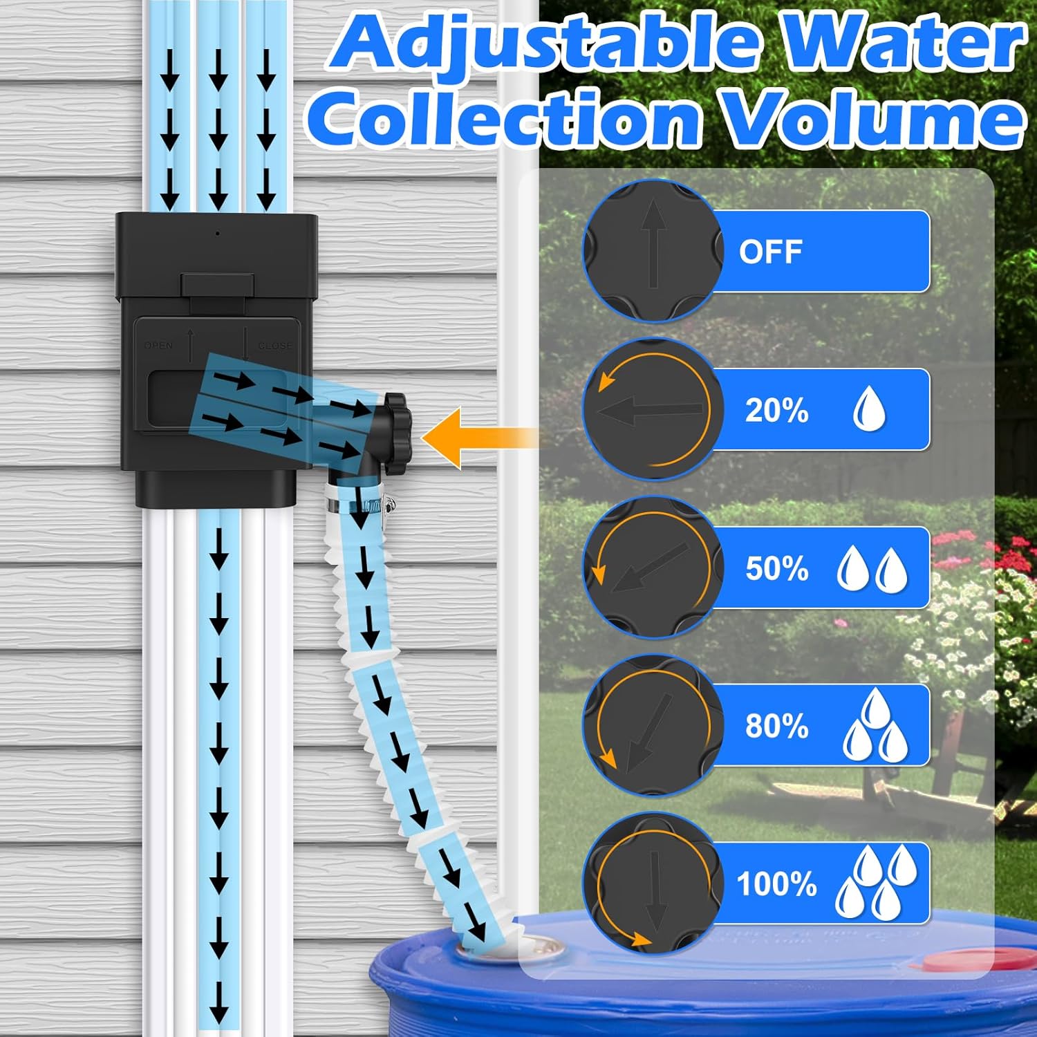 • Adjustable Water Collection: The valve of the rainwater collection system can adjust the amount of rainwater collection. There are 5 types of water flow control: closed, 20%, 50%, 80%, and 100%. If the rain barrel is full of water, you can turn off the switch to prevent rainwater from entering the rain barrel and prevent water from overflowing.