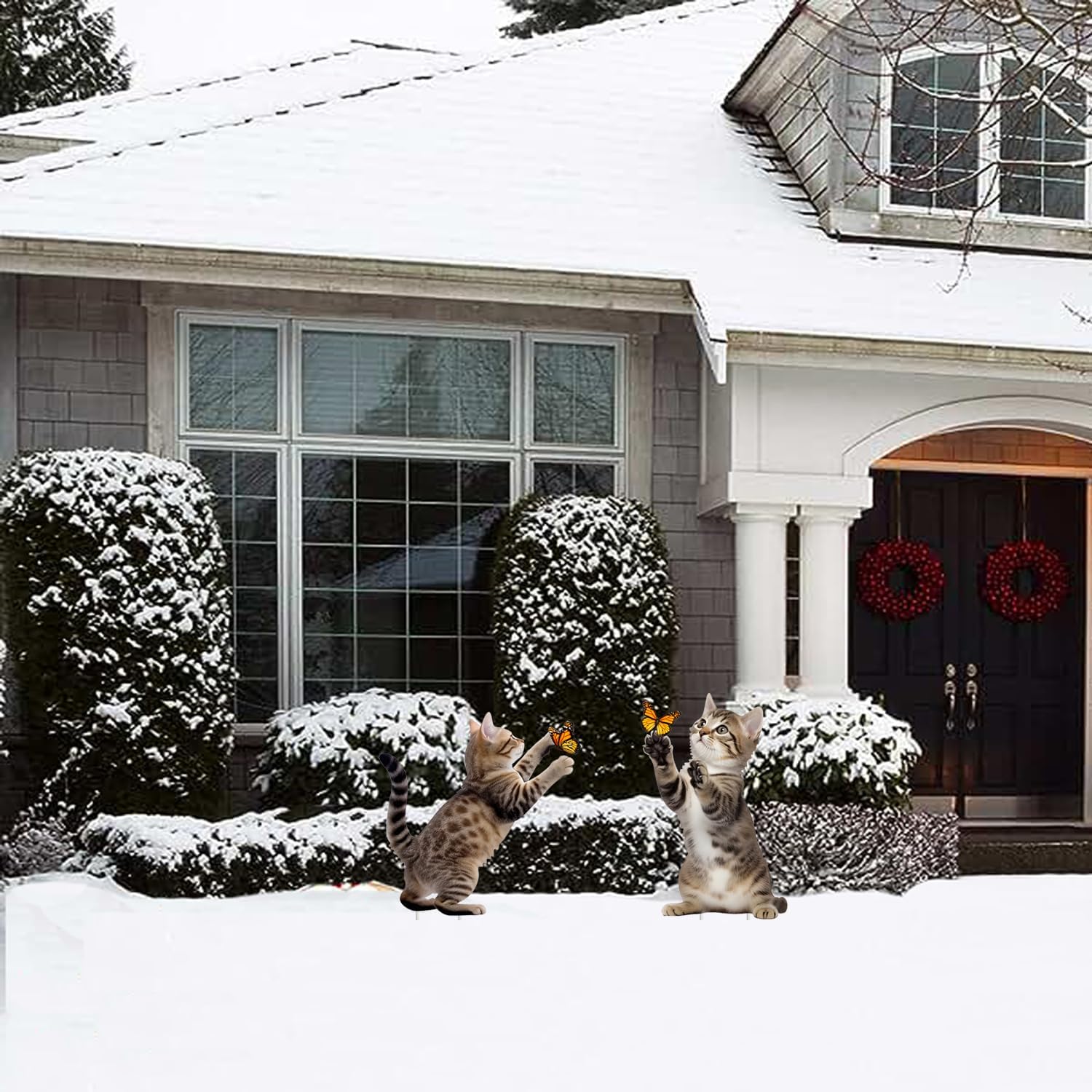 Metal Garden Stakes Decor,Cute Cats Playing with Butterflies Stakes, YGarden Statues Bird Repellent Cat Decorative Garden Stakes for Yard, Garden, Lawn Outdoor Decorations Set of 2