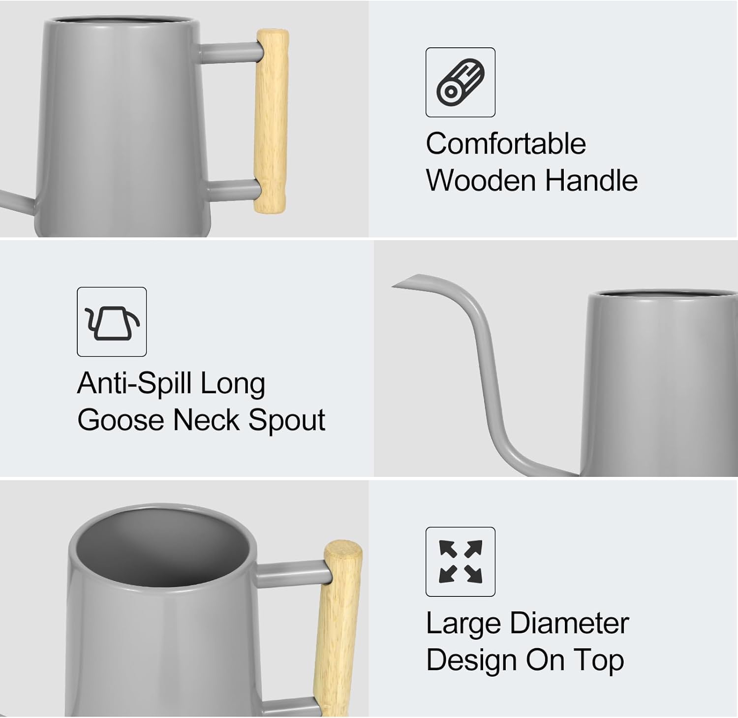 • [COMFORTABLE WOODEN HANDLE] The indoor watering can has a round comfortable wooden handle that is easy to grasp and won't cut your hands.This stainless steel watering can open built-in open top design, it is convenient to refill water