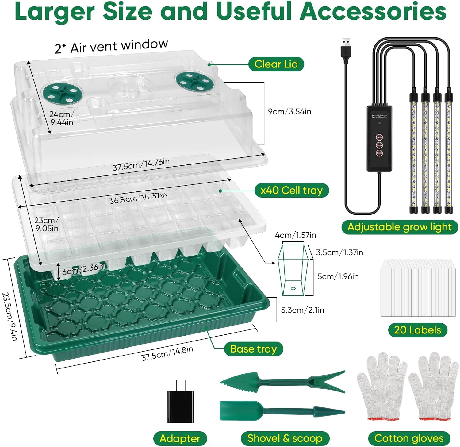• 【360°Spectrum Grow Light】 Larger grow light cover spectrum for better seedling grow, this product has upgraded 4 full spectrum strip plant growth lights insert on the Dome of the plant starter kit, and also has improve the light. Now you can adjust and timed the light as you need, you don’t have to stay at home ! Withe& blue Light will help seedling growing faster and better. You can use this product by USB port or just plug-in,4 lighting modes & 4 timing functions (3H/6H/12H/18H) & 5 brightness modes, providing a better garden tool for anyone!