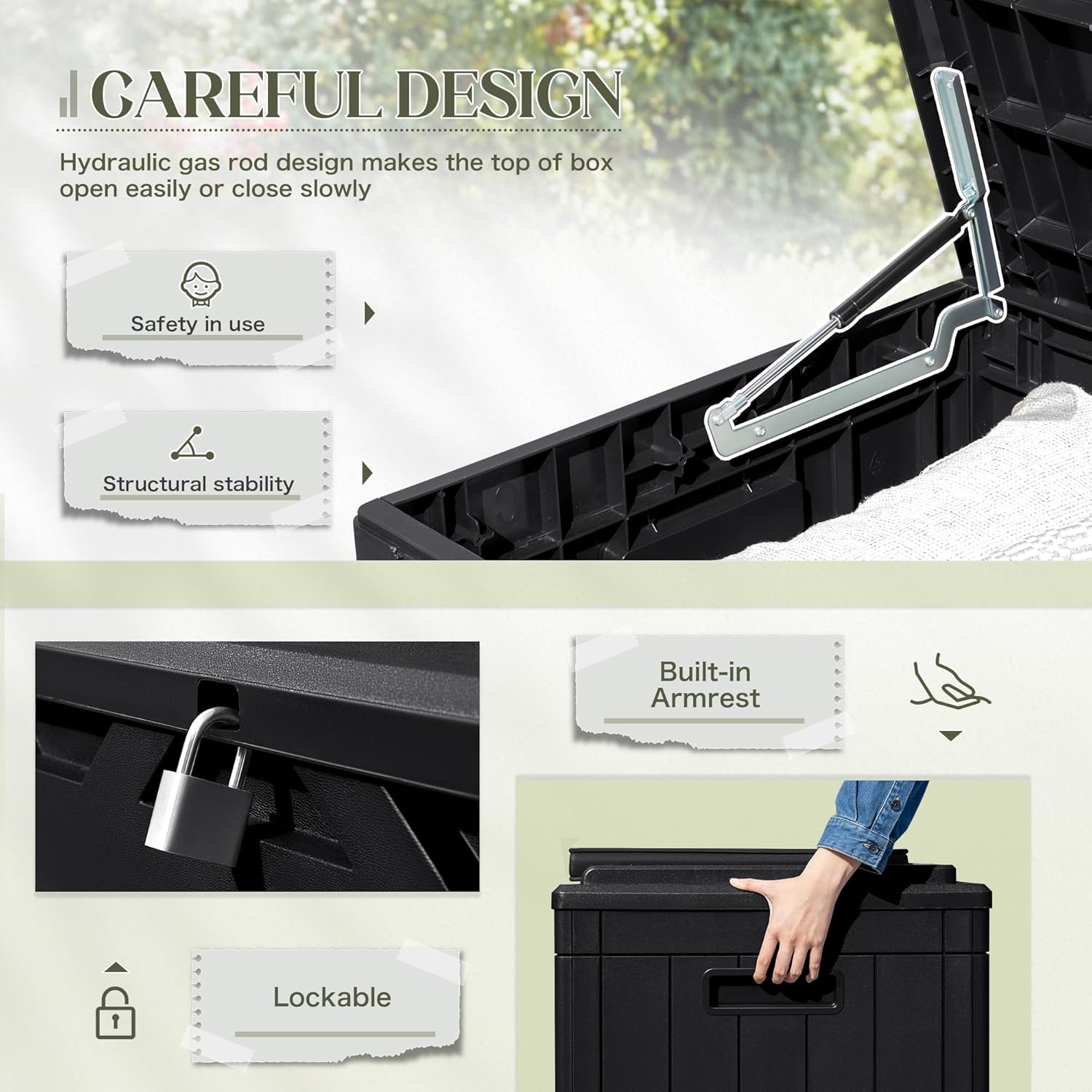 • PRACTICAL DESIGN: The deck box has a hydraulic holder design, which can prevent your hand from being caught when you open and close the box to ensure safety. Meanwhile, there is a support bar designed inside the lid, which can enhance the durability of the storage box.