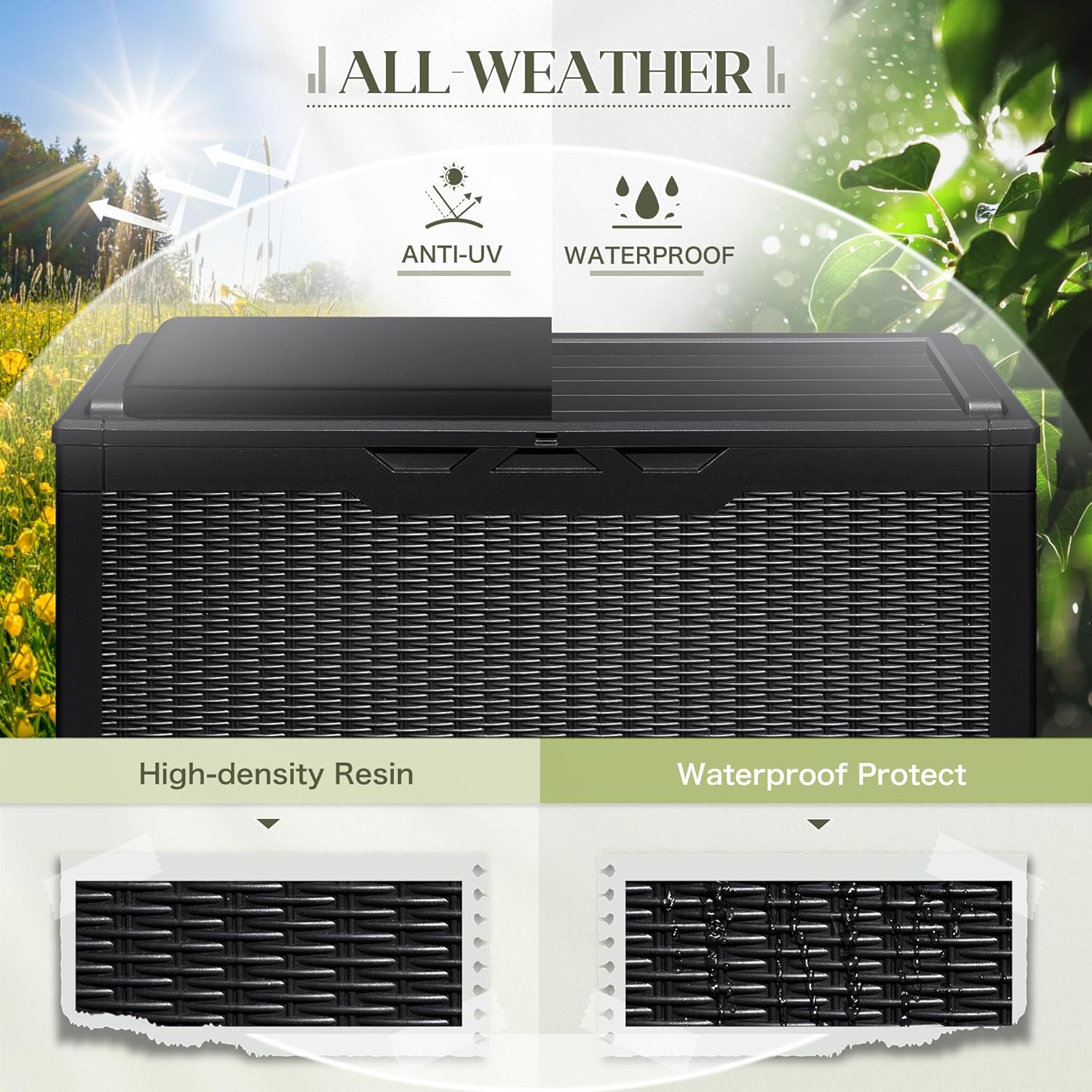• RESIN MATERIAL: The storage box is made of environmentally friendly resin material, this material has good anti-color fading and waterproof and UV resistance, and very good toughness and durability.