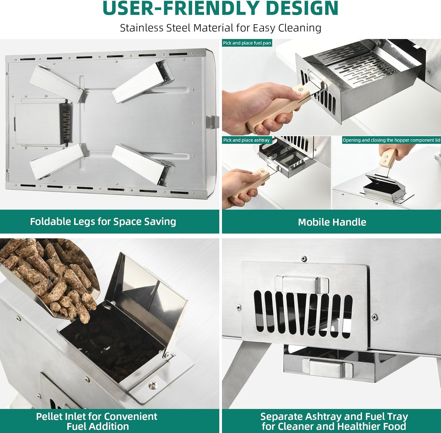 • User-Friendly Design: Designed with convenience in mind, the pellet pizza oven features a mobile handle for easy opening and closing of the pellet hopper, as well as effortless placement of the fuel tray and ash tray. The pellet hopper entrance allows for convenient addition of pellets, while the separate ash tray and fuel tray ensure cleaner and healthier cooking.