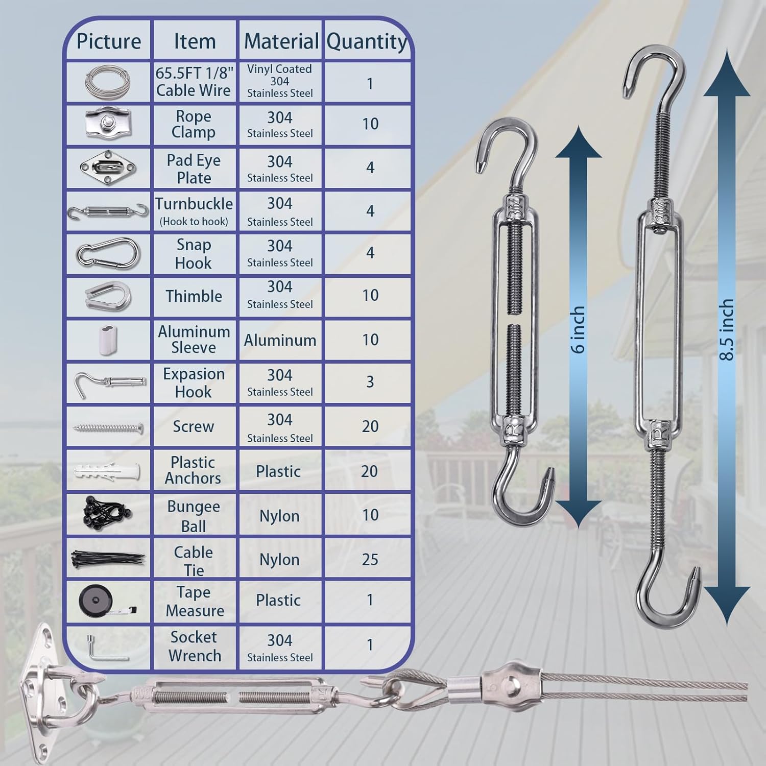 • 【Package Included】:Total 123PCS ,Included 1 x 65.5FT 1/8" Vinyl Coated Stainless Steel Cable Wire ; 4 x M6 Pad Eye ; 4 xM6 Turnbuckle; 4 xM6 Snap Hook ;10 x M5 Rope Clamp ; 10 xM3 thimble ; 10 xM3 aluminum sleeve ; 3 xM6 expansion hooks; ; 20 xScrew; 20 xplastic anchors;10 xBungee ball;25 xNyln cable Ties;1 xSocket wrench;1 xTape Measure .