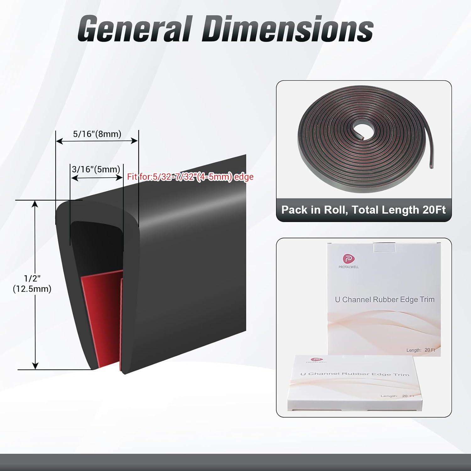 Rubber Edge Protector, Flexible Self-Adhesive U-Channel Trim, 3/16" Thick, Black, 20Ft - Protects Glass, Mirror, Plywood, Steel Panel Edges