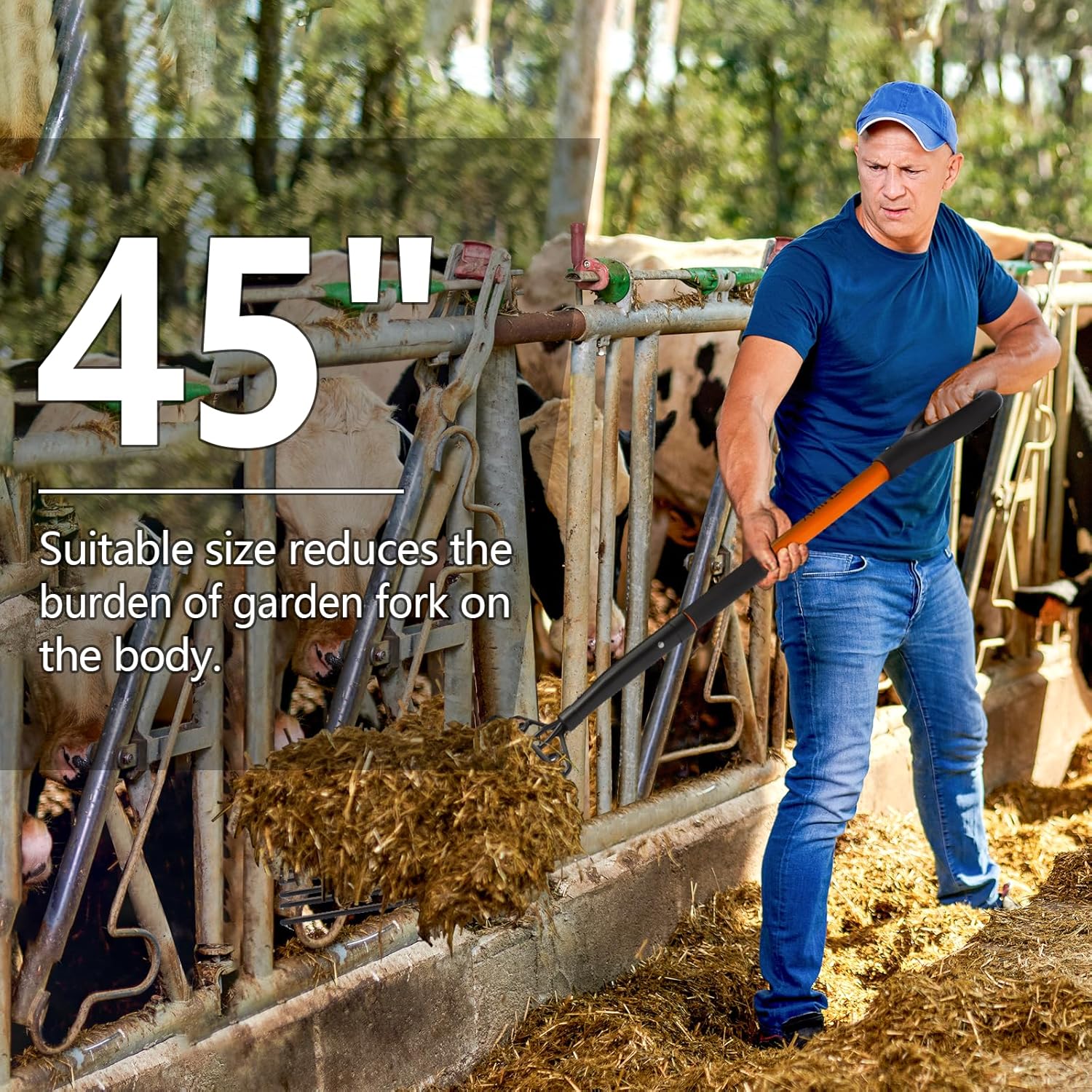 • Premium Quality Material: Crafted through a quenching process, this high-carbon steel pitchfork offers excellent hardness and wear resistance, not easy to breaking or bending. The curved head design of the garden fork cover and moving debris easier, helping you tackle a variety of gardening tasks effortlessly.