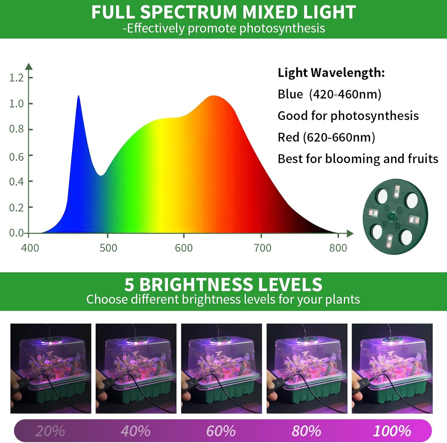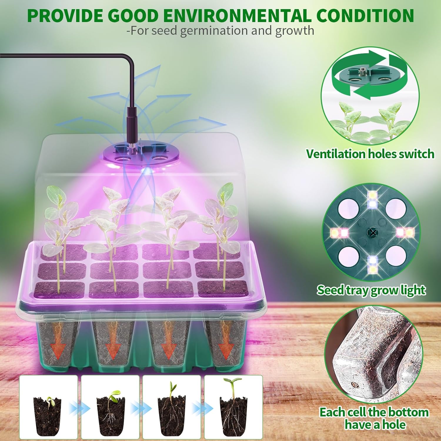 • Full Spectrum LED Plant Lights: Each seed starter tray comes equipped with 8 LED plant lights that provide a full spectrum of light, mimicking natural sunlight to facilitate robust and healthy plant growth.