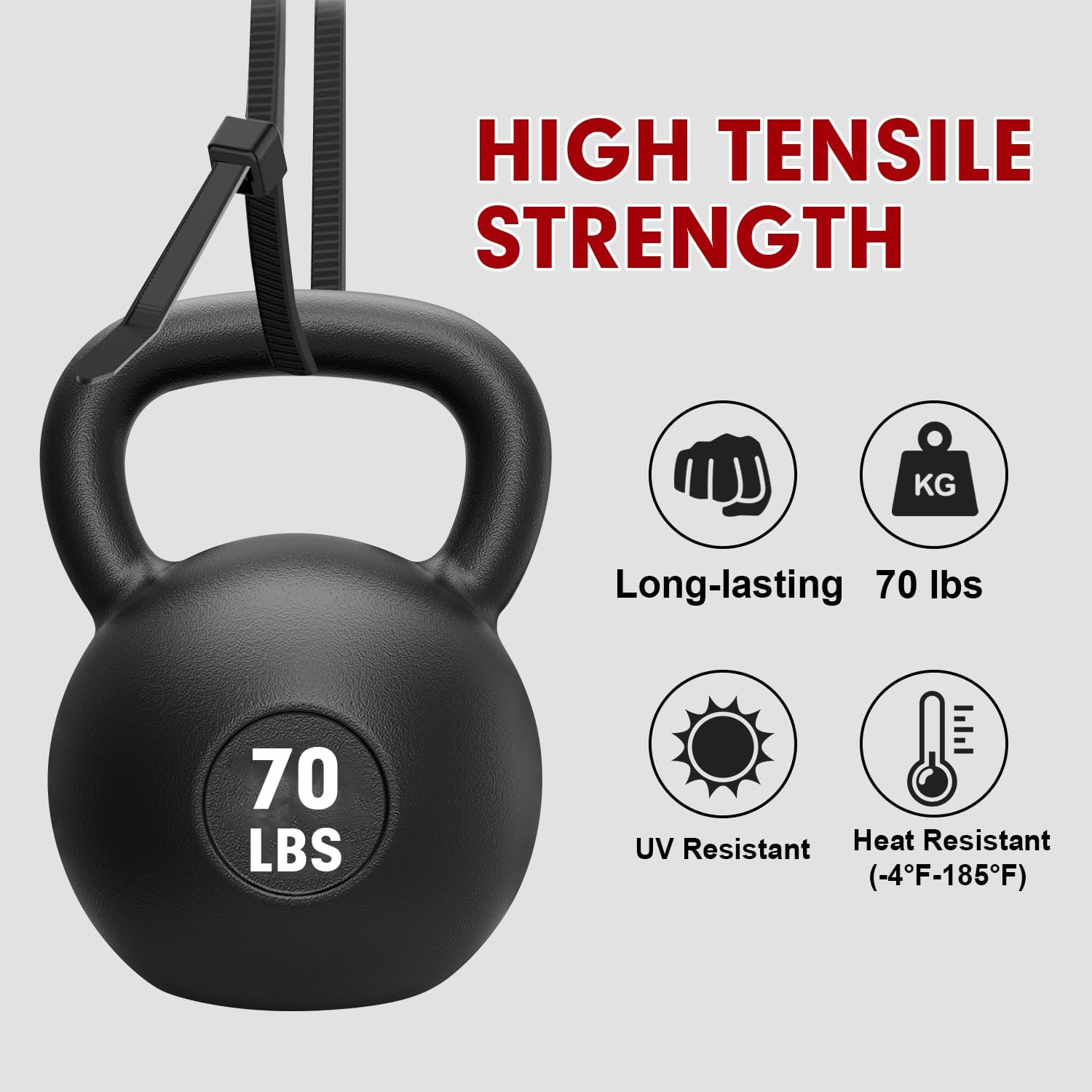 • 70LB TENSILE STRENGTH: The more width, the more tensile strength. Our wire ties is 0.19 inch(4.8mm), while industry standard is 0.14 inch(3.6mm), thickness of 12inch zip ties is 0.057"(1.45mm), more tensile strength