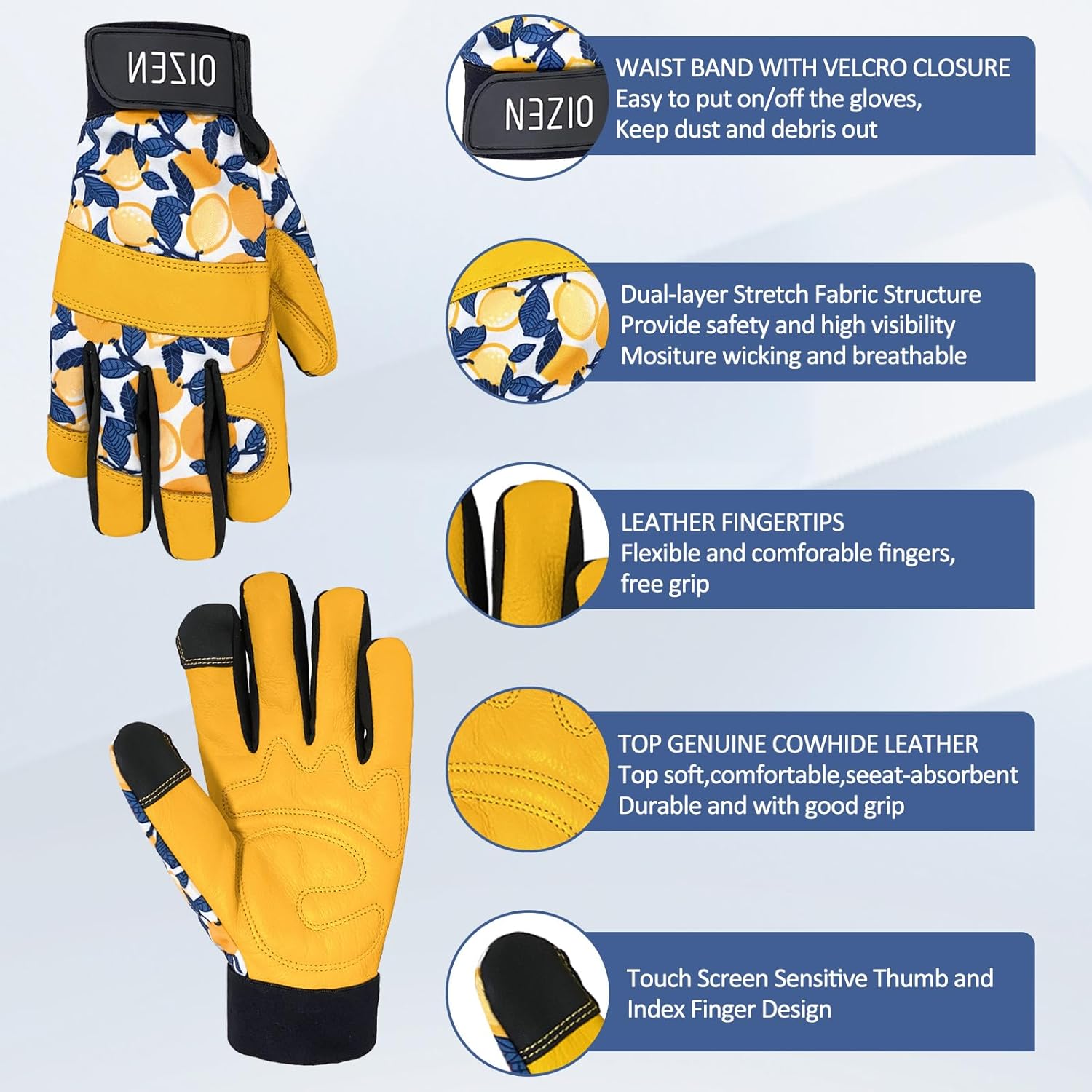 Cowhide Leather Thorn Proof & Puncture Resistant Gardening Gloves for Women and Men, Touchscreen Compatible Working Gloves for Weeding, Digging, Planting, Gardening Gifts for Women (Large)