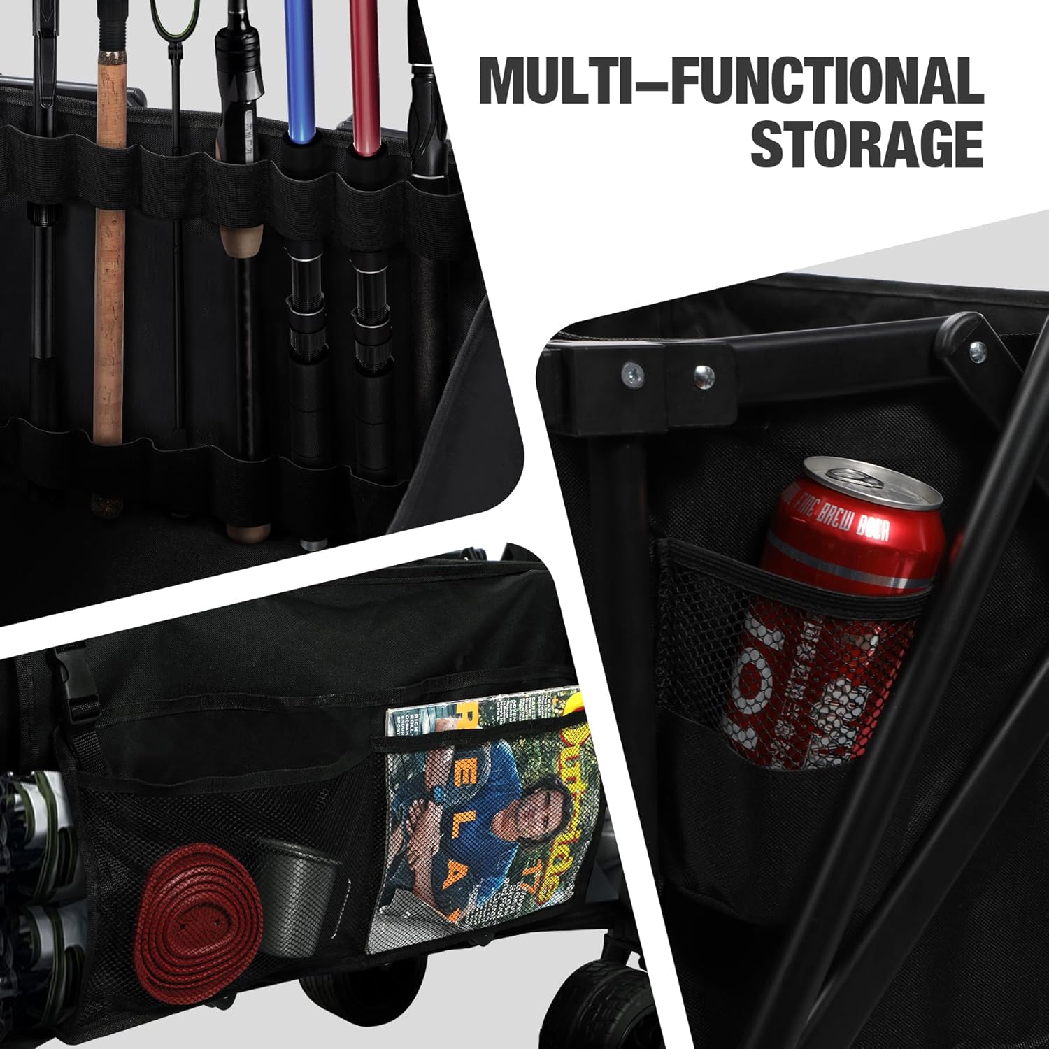 • Extendable & Rod Holder: The fishing wagon has a tailgate, which can be used as an extension to hold longer items. The practical design of fishing rod fixing webbing and side pockets can better store 6 fishing rods and other items. It is very suitable for people who love fishing.
