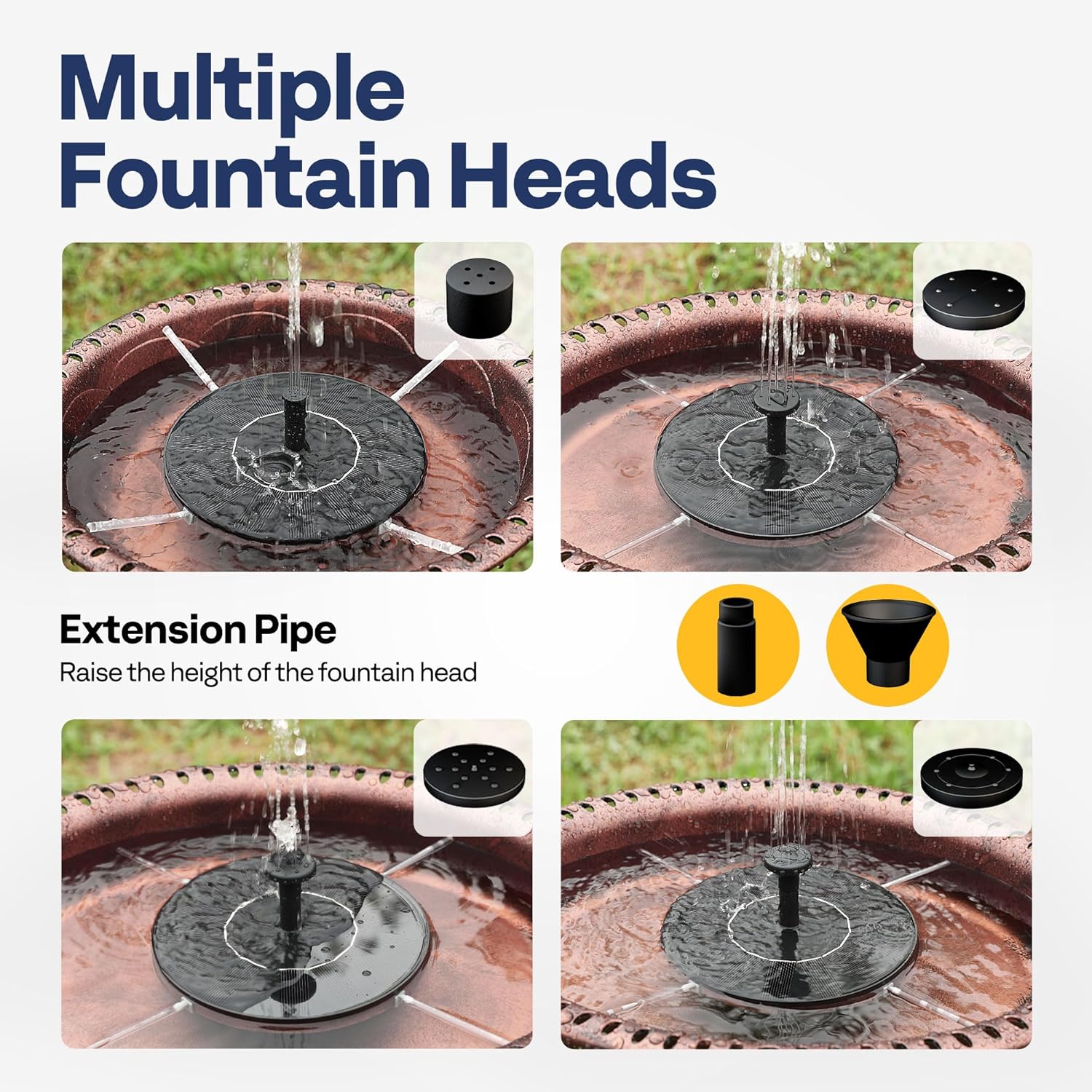 • COMBO SET: This package includes a 5-forked bird bath, a 1.4 W solar water fountain, and four different spray nozzles; The fountain can be configured to create a beautiful display with four different patterns, which may attract and entertain birds; The bird bath set is a suitable and lovely addition to any garden, patio, yard, deck, or other outdoor space