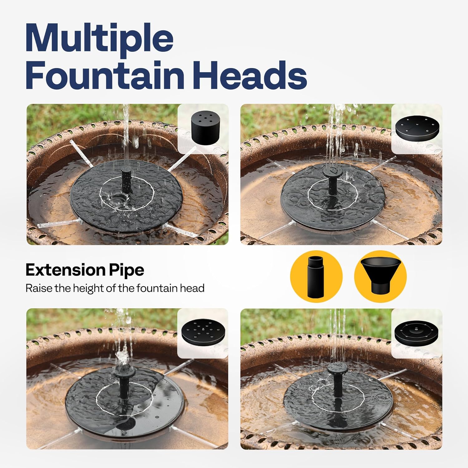 • COMBO SET: This package includes a 5-forked bird bath, a 1.4 W solar water fountain, and four different spray nozzles; The fountain can be configured to create a beautiful display with four different patterns, which may attract and entertain birds; The bird bath set is a suitable and lovely addition to any garden, patio, yard, deck, or other outdoor space
