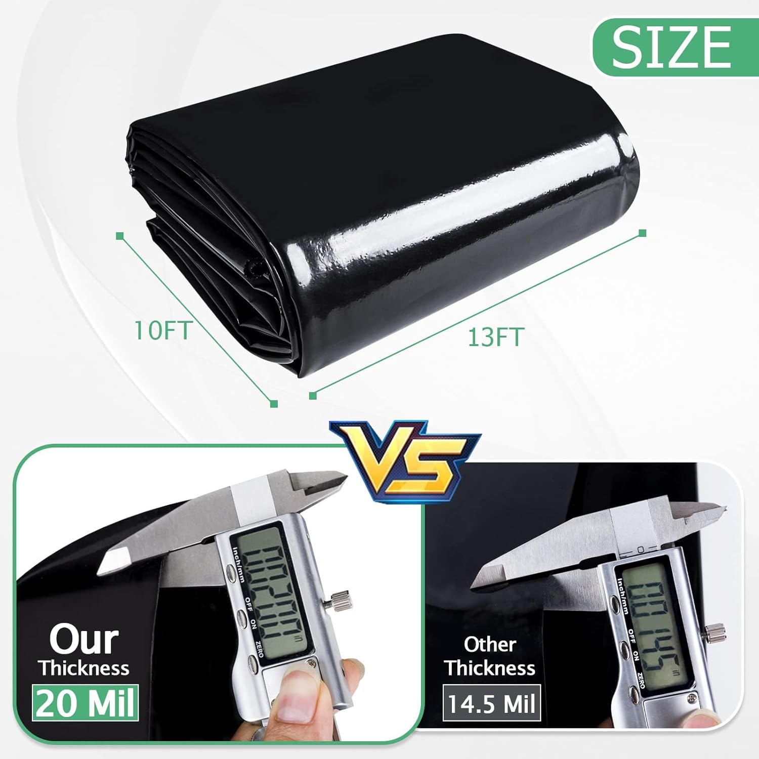 • 【Super Thickness】The thickness of Pond liner is 20 Mil with super preventing leakage. Compared with other 14.5 Mil and 4.5 Mil, our thickness is stronger and more durable. The material is soft and adaptable to ponds of various angles and shapes.