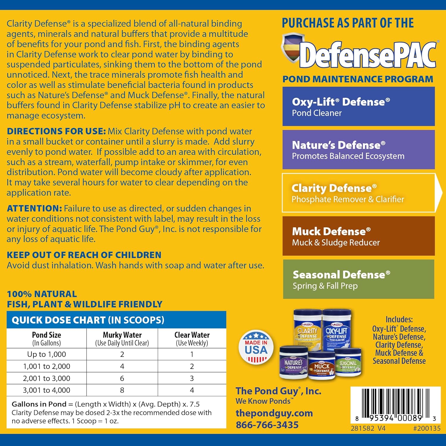 • Easy to Use Pond Maintenance -- When used regularly, Clarity Defense helps maintain crystal clear pond water all season. All natural and safe for animals, fish, pets, plants, and the environment.
