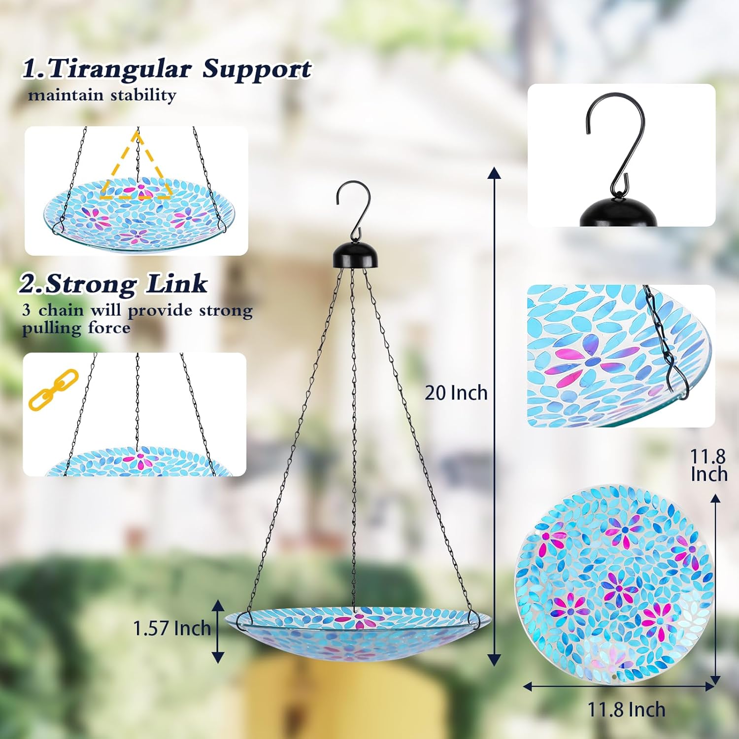 • Beautiful Mosaic Flower Bird Bath: Uses special substantial nontoxic glass, causes zero harm to birds and other creatures, and this hanging mosaic bird bath has beautiful flower pattern and distinctively bright-colored which would attract more birds to bathe