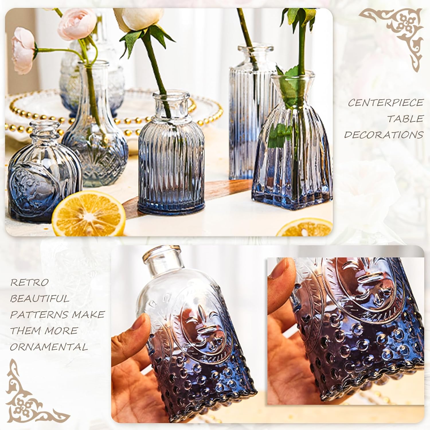 • Different Retro Designs: The set contains 24 small bud vases in bulk with different sizes, shapes and styles. The surface of mini vases bud vases in bulk are all embossed, exquisite, beautiful, unique and textured, and sparkles under the light. Note: Actual colors may vary slightly due to different monitors and lighting.