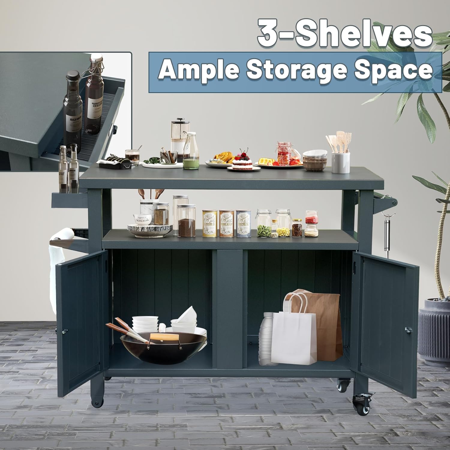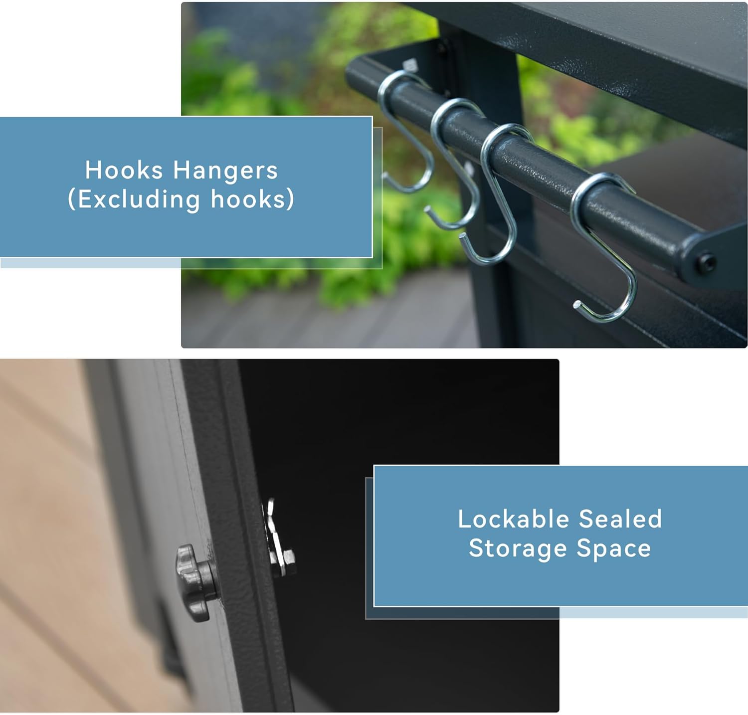 • Ample Storage Space - the outdoor grill prep cabinet table is designed with three-tie of the griddle stand which provide plenty of storage space. The open storage area offers 26 gallons, perfect for storing grilling tools and accessories. The enclosed cabinet provides 57 gallons of storage capacity, allowing for even more room for miscellaneous items