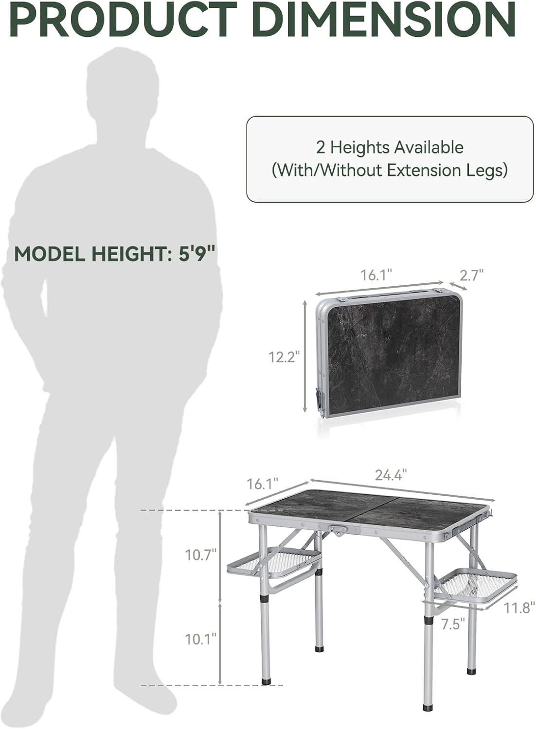 • Lightweight & Strong Load-bearing. Our folding camping table is made of 90% aluminum & 10% density board, ensuring that it is light and strong at the same time. The picnic table is 6lbs heavy and supports up to 70 lbs, and each wing supports up to 20 lbs.