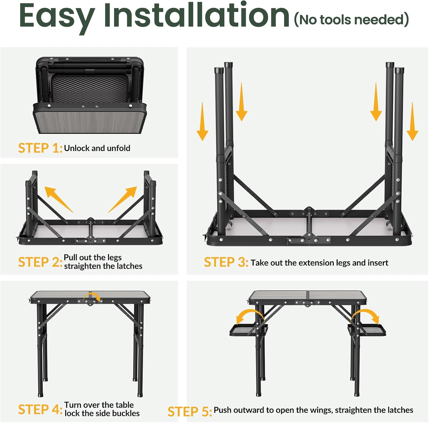 • Simple 5-step Installation (No tools needed). Step 1: Unlock and unfold. Step 2: Pull out the legs and straighten the latches. Step 3: Take out the extension legs and insert. Step 4: Turn over the table and lock the side buckles. Step 5: Push outward to open the wings, straighten the latches. Done. Please refer to the installation steps in the picture.