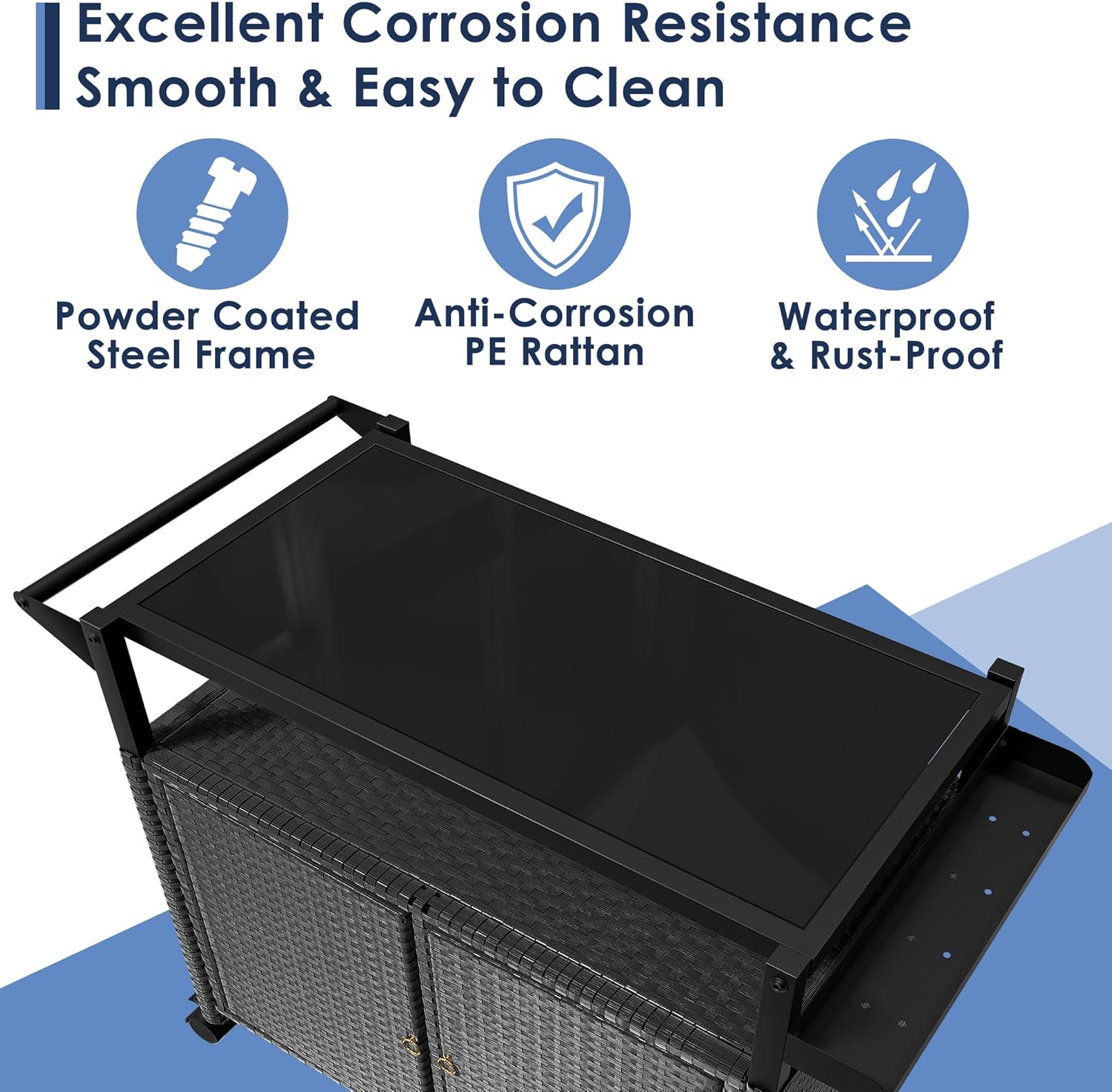 • 【Modern Patio Bar Cart】Featuring a 5mm black tempered glass top and an enclosed wicker storage cabinet, this outdoor bar cart seamlessly blends beauty with practicality, making it a must-have for your poolside, patio, or outdoor kitchen. Total 74 gallons storage capacity (54 gallons enclosed cabinet + 20 gallons open shelf), it offers ample space for all your outdoor essentials