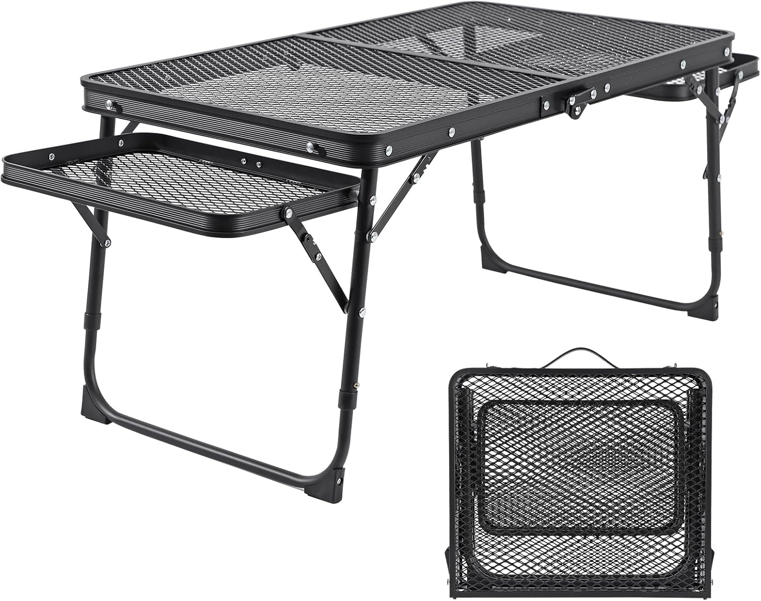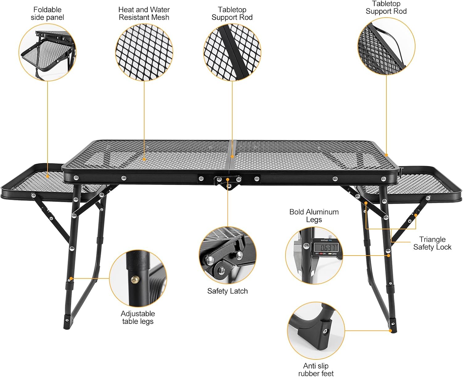 • 【𝐃𝐮𝐫𝐚𝐛𝐥𝐞 𝐚𝐧𝐝 𝐡𝐞𝐚𝐭-𝐫𝐞𝐬𝐢𝐬𝐭𝐚𝐧𝐭&𝐰𝐚𝐭𝐞𝐫𝐩𝐫𝐨𝐨𝐟】:Consists of a durable aluminum frame and a sturdy metal steel mesh table top.𝐓𝐡𝐞 𝐅𝐨𝐥𝐝𝐢𝐧𝐠 𝐂𝐚𝐦𝐩𝐢𝐧𝐠 𝐓𝐚𝐛𝐥𝐞 very heat and water resistant, you can put your stoves on it, and you don't have to rush to clear the table on a rainy day.