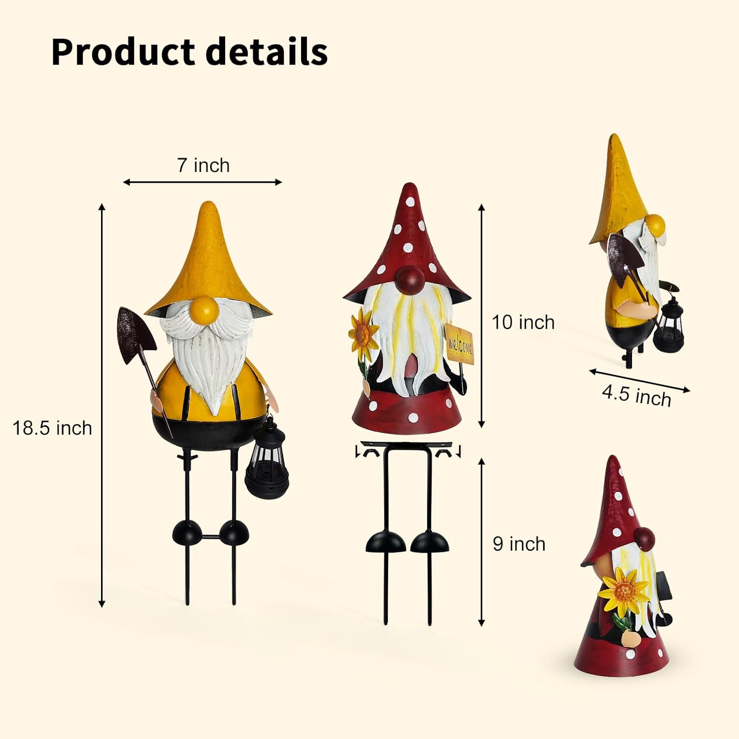 • 【Practical Gnome Decorations】The metal gnome garden stake is 18 inch tall. handcrafted gnome body structure, easy to assemble, 2 screw bases at the bottom of the gnomes, which can be firmly connected with stakes as garden decorative stakes, making your yard and garden more lively & interesting