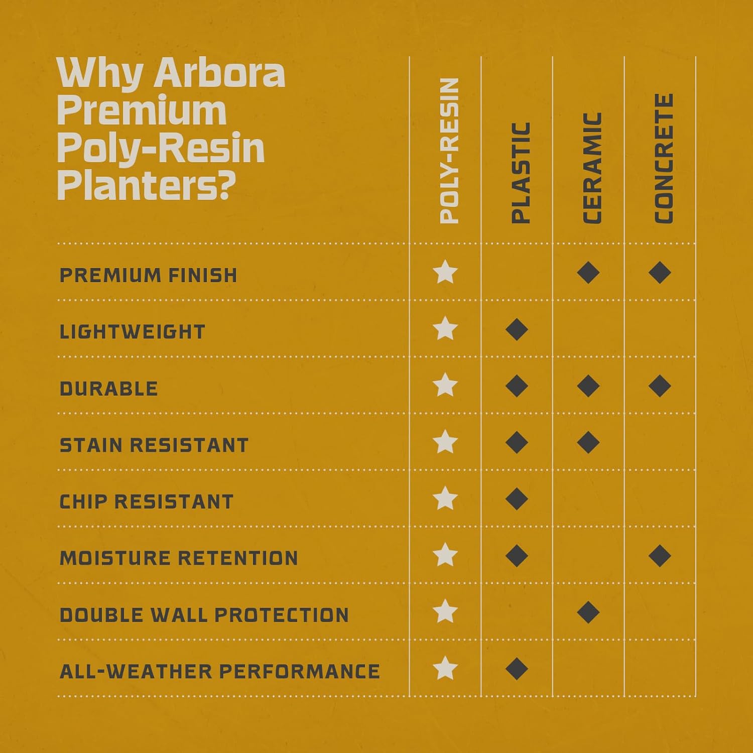 • Weatherproof & Durable - Constructed with resilient resin, Arbora pots are weatherproof and fade-resistant, maintaining their integrity season after season. Featuring double-walled insulation, experience superior plant protection in any weather.