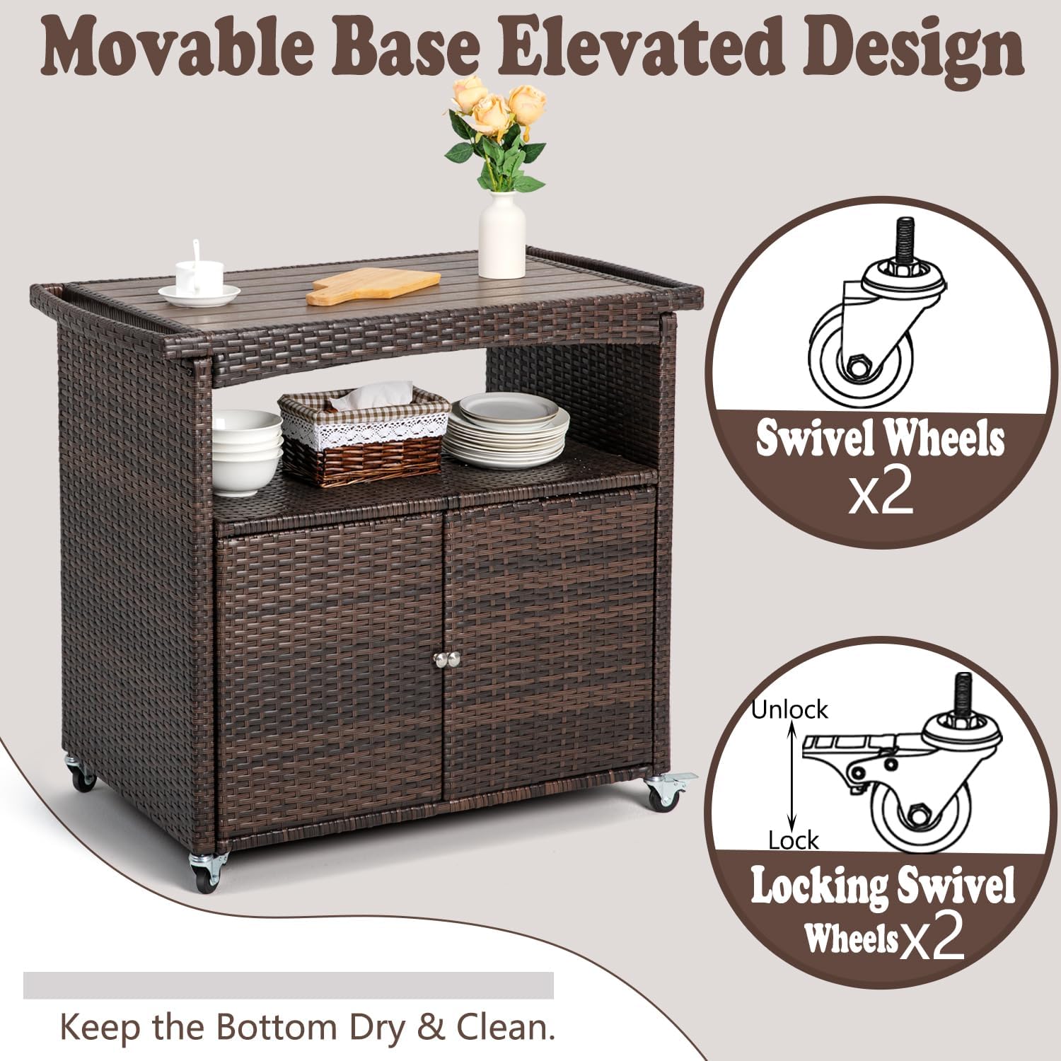 Outdoor Storage Cabinet,Outdoor Cabinet for Patio Bar Cart with Rolling Wheels Patio Bar Table with Storage Wicker Buffet Cabinets prep Table Kitchen Serving Cart with Door,Shelves,Handle Brown
