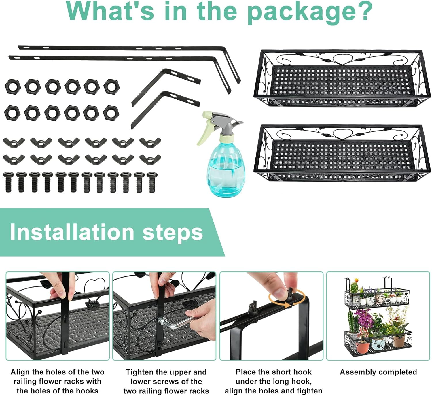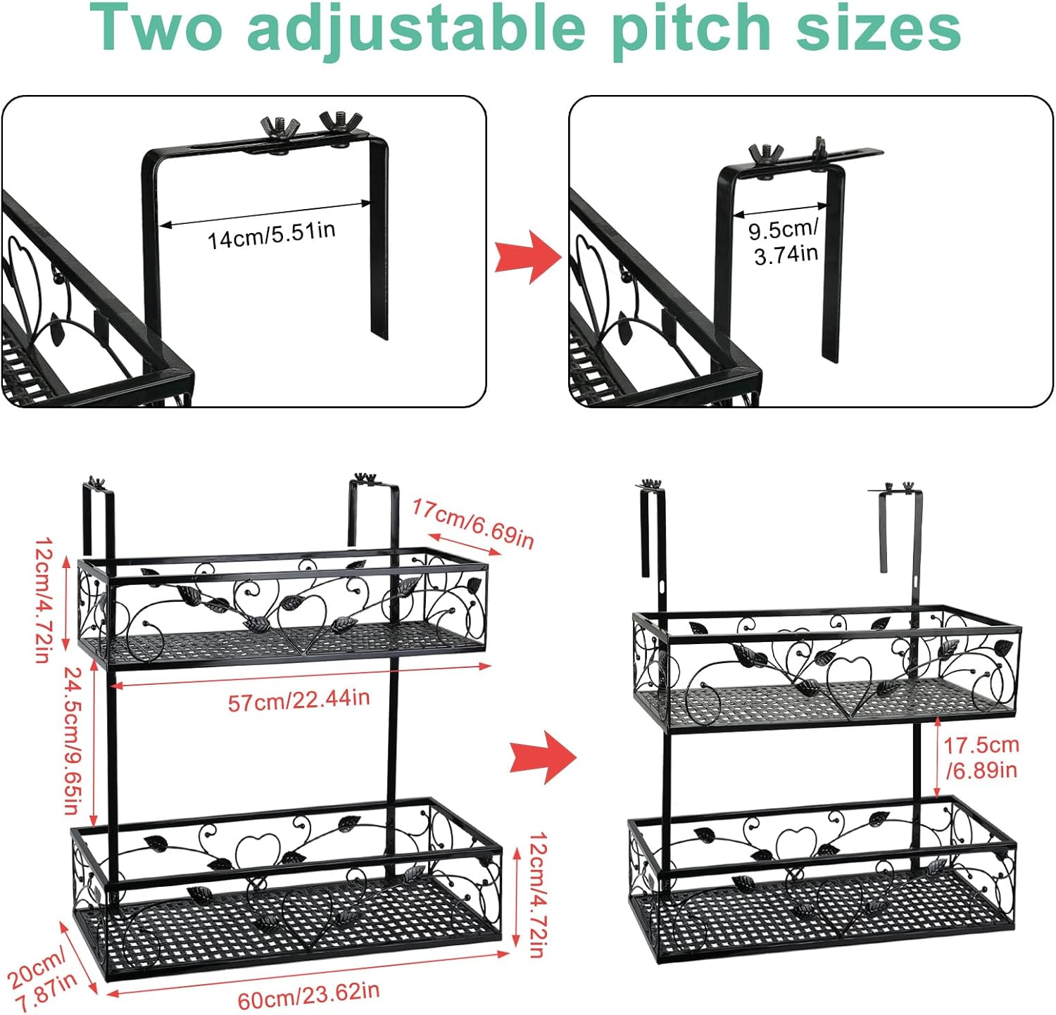 • 2 Tiers Large Capacity Hanging Planter Shelf : The planter basket is designed with an artistic square shape, and overall measures 24*8*23.2in(L x W x H), providing large space for putting succulents and small potted plants. The width of the adjustable railing planter can be adjusted from 2.1" to 4.9" and the hook has multiple holes, which can adjust the height of the flower basket according to your needs. And it can not only let your plants enjoy enough sunlight for better growth while making your balcony more charming. With a gardening spray bottle for plants beauty