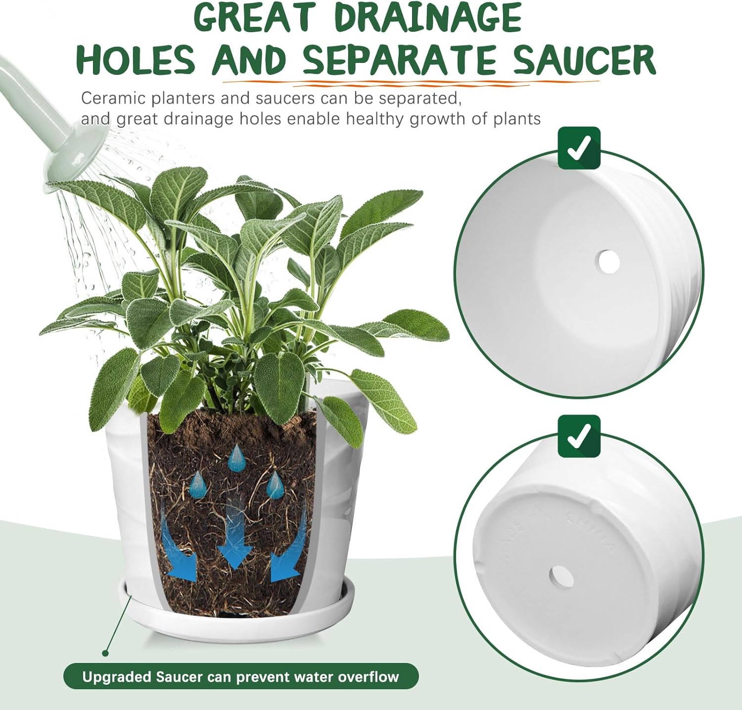 • 【With Drain Holes and Saucers 】 The drain hole in the middle of the bottom of the planter can drain out excess water, allowing the plant to grow healthier. There are saucers to catch excess mud and water so as not to stain the floor.