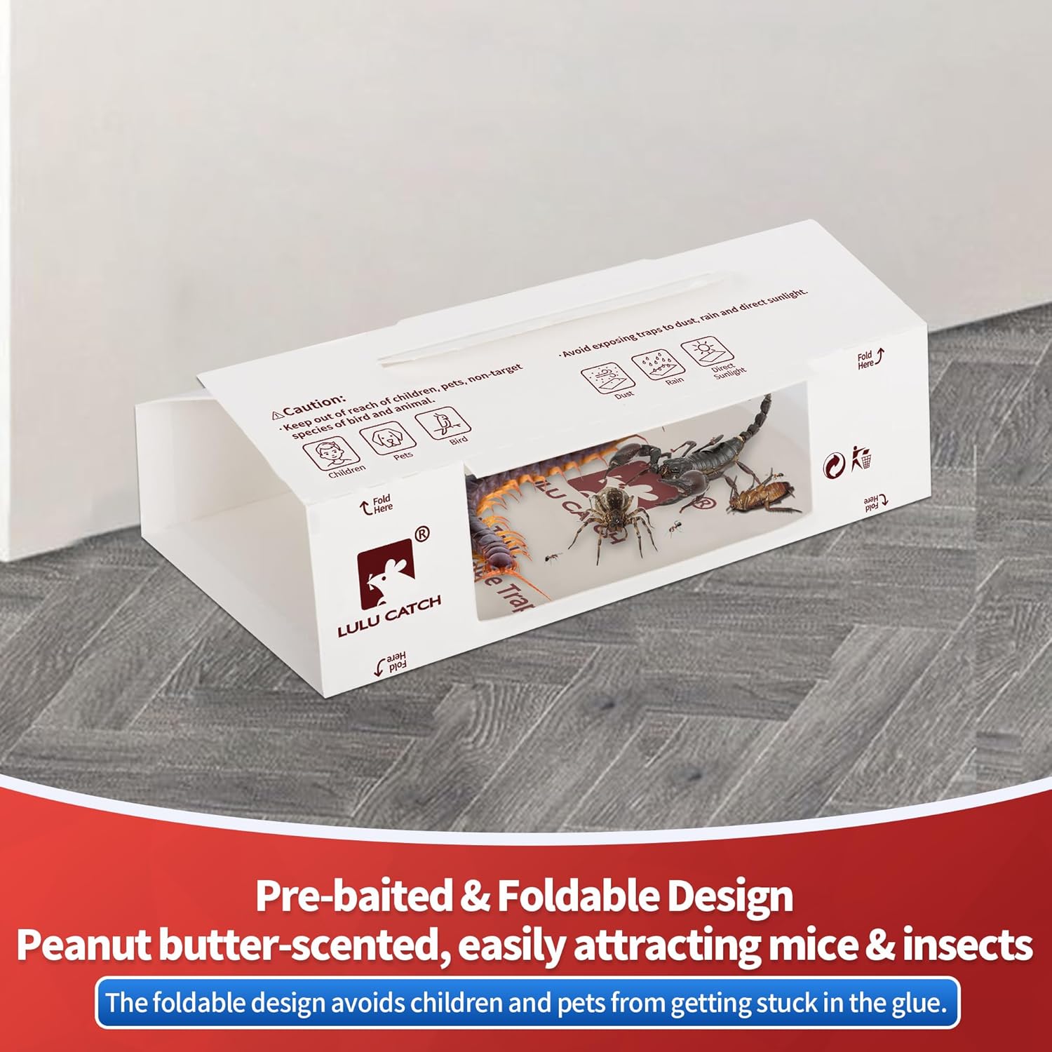 • PRE-BAITED & NON-TOXIC BUG CATCHER: The sticky glue traps are extremely easy to use and budget-friendly, not requiring any additional baits. The tray is generously coated with sticky glue with a built-in peanut butter scent, which easily occupies the mouse's attention. These spider traps can be safely placed around your home or at your workplace.