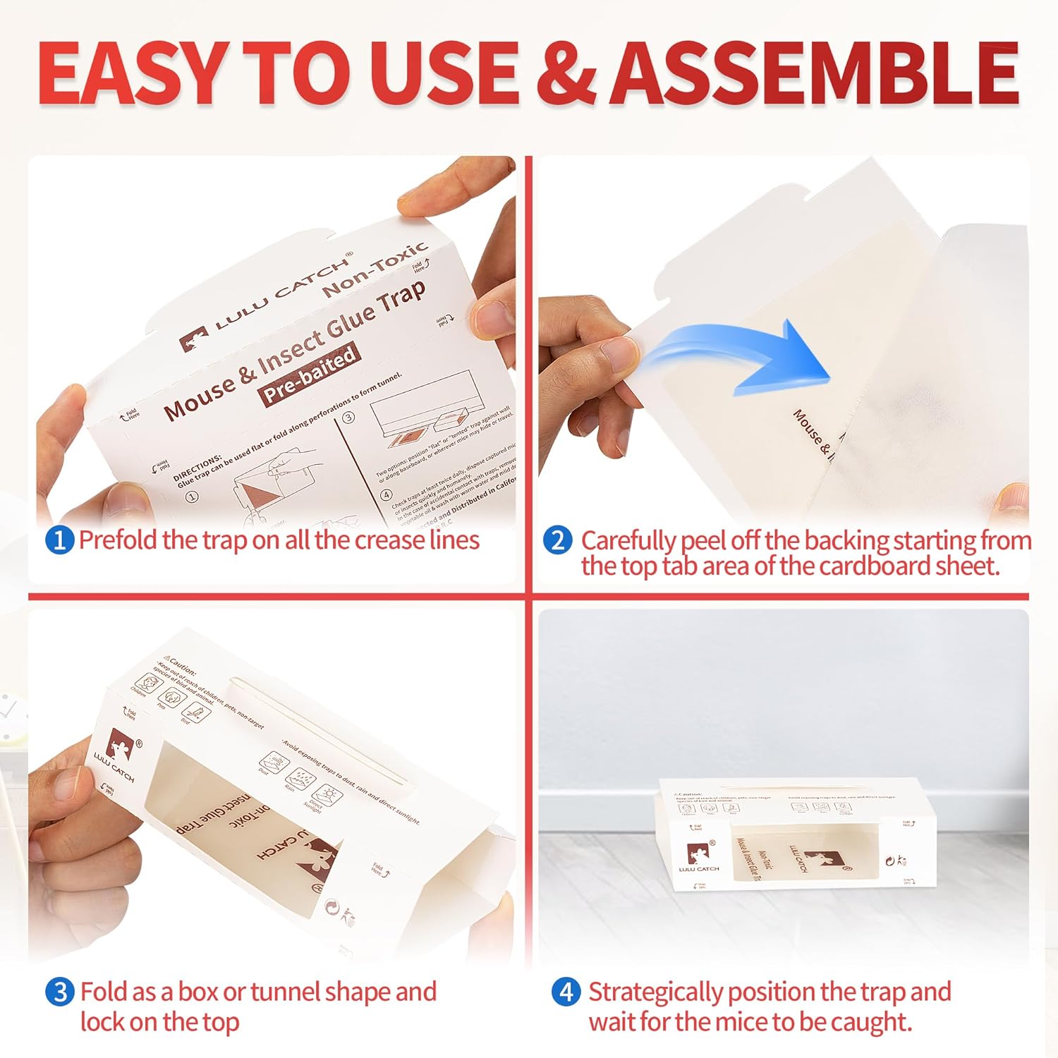 • EASY TO ASSEMBLE STICKY TRAPS: This sticky trap comes with 12 glue boards. Four placement methods can be applied for the best capture: Flat, U-shape, Tunnel Box, and Double Up. No need to clean, re-set, or re-bait the glue traps. We suggest carefully pealing off the backing starting from the top tab area of the cardboard sheet. These glue traps are disposable, just wrap them and throw them straight into the garbage can.