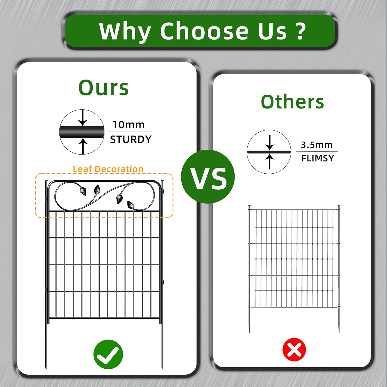 • STURDY STRUCTURE: The decorative garden border fence panels made of welded by thick iron wires and thick iron tube frame, The stakes are 8mm diameter. The surface of the garden fencing with anti-rust black color powder coated outside, Which are durable and safe for decorating the yards outdoors.