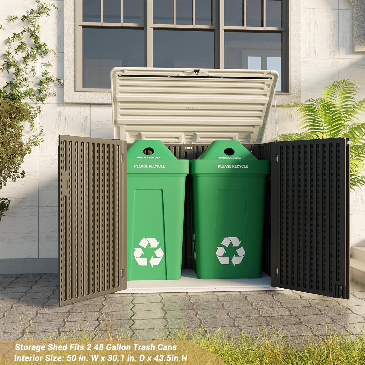 • 【Larger Capacity for Outdoor Storage】— External Size: 53.2 in. W x 34.3 in. D x 47.1 in. H; Interior Size: 50 in. W x 30.1 in. D x 43 in.H, Capacity: 48 Cubic Feet.This upgraded larger storage shed more perfectly store outdoor items, such as trash cans, garden tools, firewood and more suitable for all kinds of occasions: indoor, outdoor,balcony, yard, garden, street, etc.