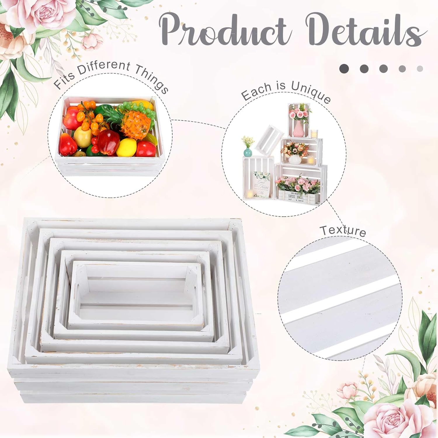 • Practical Handles and Nesting Design: the nesting design of these farmhouse wood crate boxes adds to their usefulness, allowing for easy and efficient storage when they're not in use; The inclusion of handles makes them convenient to maneuver around, fitting into your space seamlessly; These crates are a smart and versatile choice, offering practicality and storage optimization