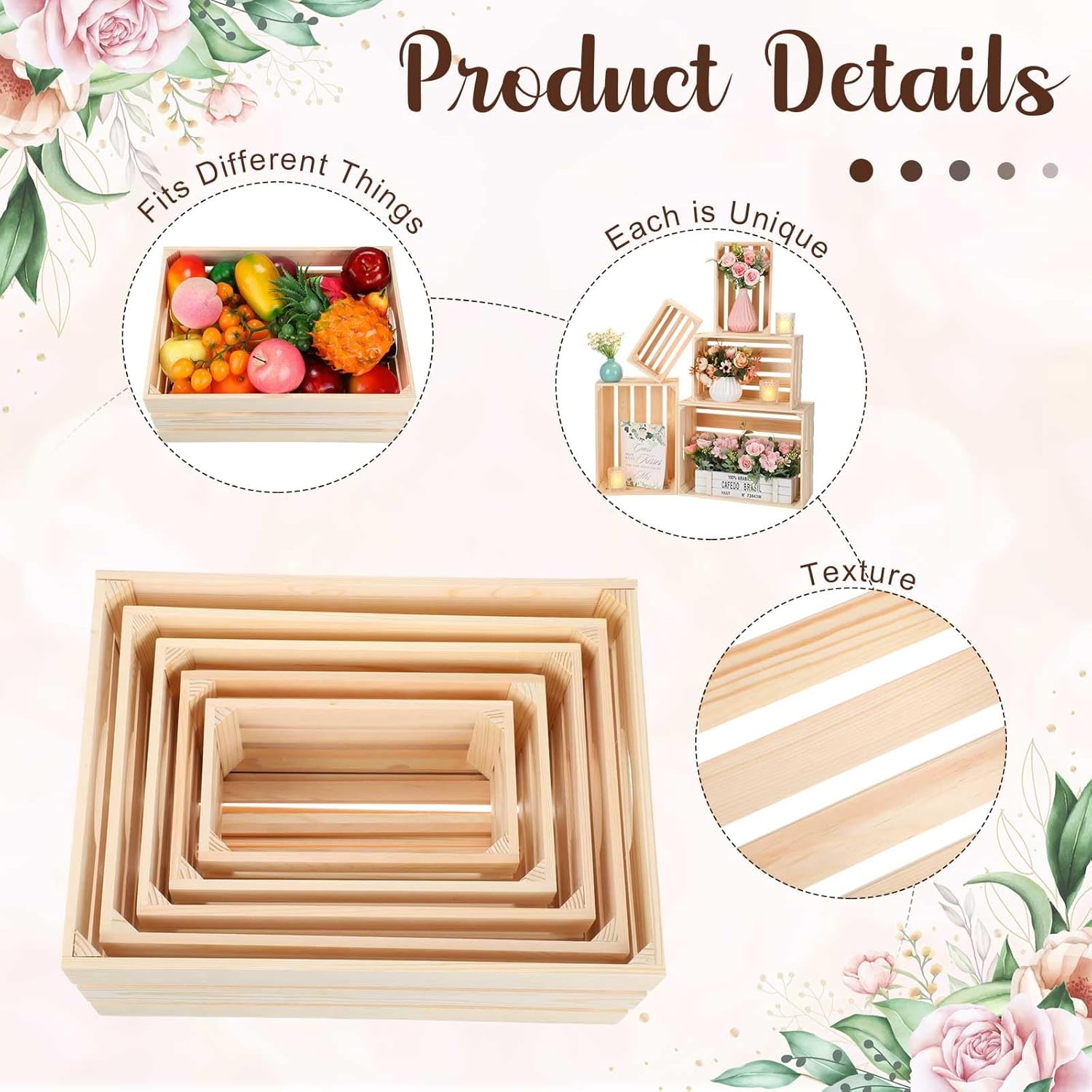 • Wide Range of Sizes: offering versatility in size, these decorative storage crates wood are designed to fit various purposes; Available in 5 different sizes, about 4.7'' x 8.5'' x 3.7'', 6.3'' x 10'' x 4.3'', 7.9'' x 11.6'' x 4.9'', 9.4'' x 13.2'' x 5.5'', 11'' x 14.8'' x 6.1'', they're nice for accommodating a myriad of decorative or storage necessities; You'll have ample options to choose from to meet your needs