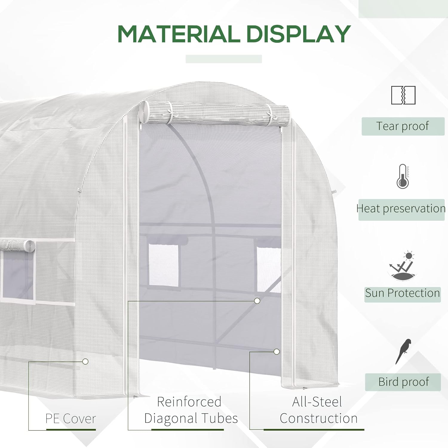 • Transparent Plastic Cover: Shield your plants effectively with our tunnel greenhouse's 140gsm PE cover, which allows 85% sunlight penetration while protecting against UV damage. The cover features a tear-resistant reinforcement grid. 6" extended edges enhance stability and effective rainwater sealing.