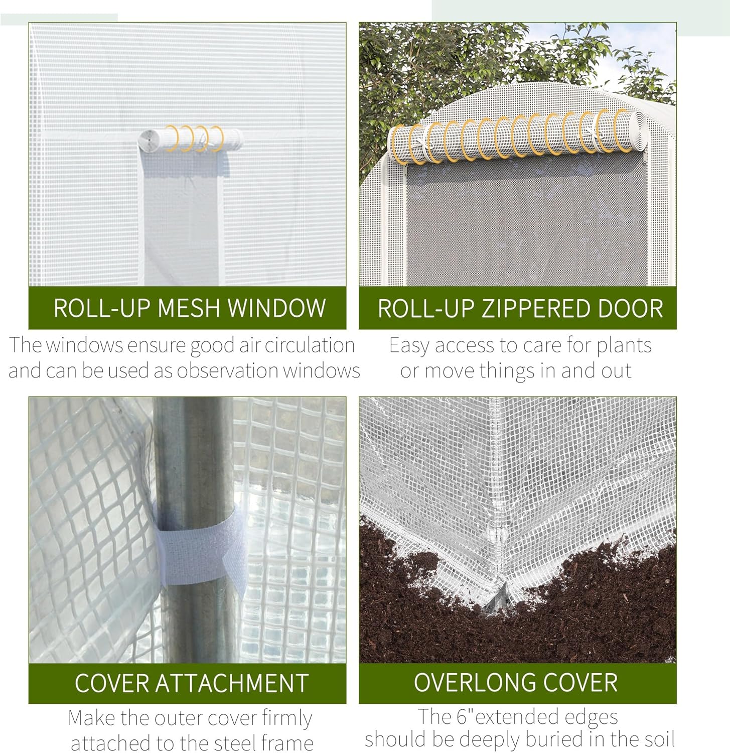 • Ventilated Roll-Up Windows and Doors: Regulate moisture with six roll-up windows and manage air flow with the large, zippered door of our outdoor greenhouse. These features allow for fine-tuned ventilation, helping to maintain optimal growing conditions while providing easy access and secure closure.