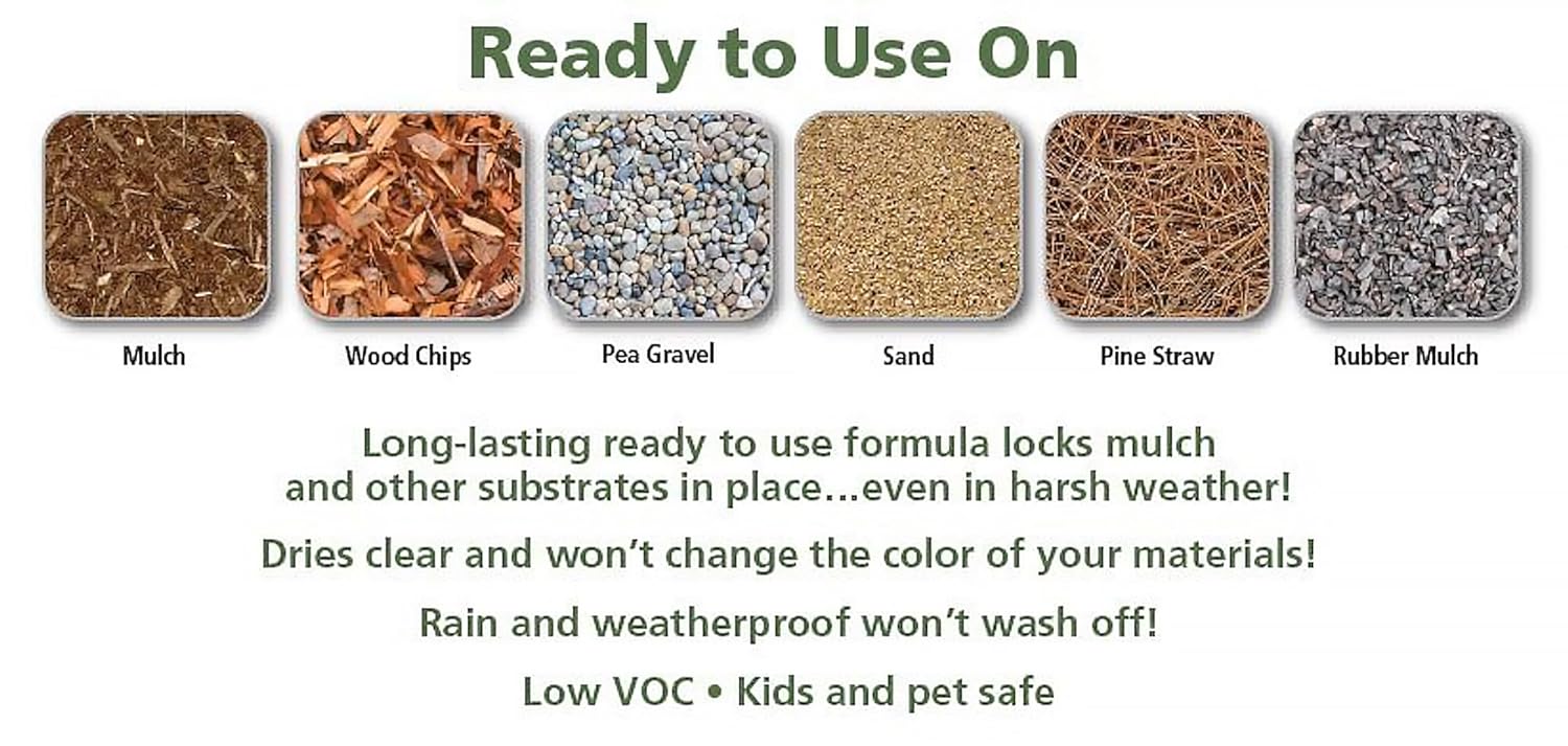 • Long-Lasting Landscape Glue: Locks mulch in place up to 2 seasons; Withstands harsh weather conditions; Prevents wash-outs and wind displacement of mulch; Maintains landscape aesthetics throughout the seasons
