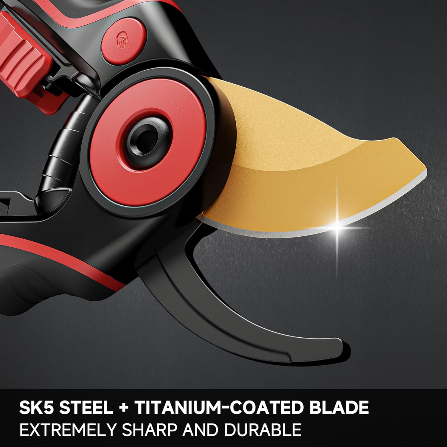 • "🔪 【SK5 High-Carbon Steel + Titanium Plating】Using imported SK5 high-carbon steel forged blades from Japan, the hardness is enhanced to HRC 54 +/- 2 through heat treatment. Combined with the golden titanium coating for rust prevention and wear resistance, it has strong corrosion resistance. These hand pruners maintain sharpness over a long period, ensuring smooth and even cuts for plants, accelerating healing and preventing diseases."