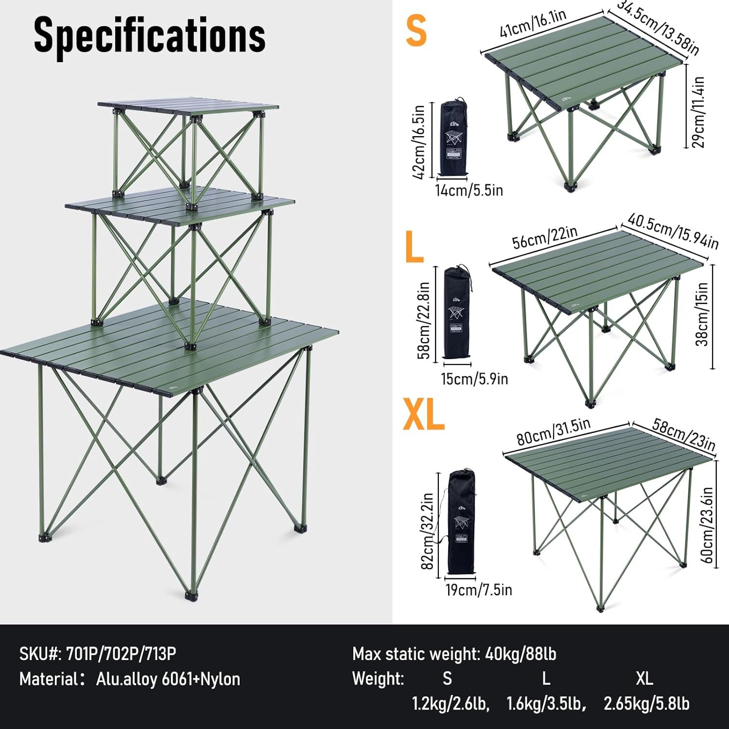 • Ultralight, made of aerospace-grade aluminum alloy, only 3.5 lbs; Max Load 88 lbs; Unlike wooden or nylon-top tables, this table is durable, waterproof, corrosion-resistant, easy to clean; Sturdy joints and anti-slip feet keep the table stable, with legs that won’t fold, bend, or slip on any terrain; Very easy to set up, just open the base frame and attach the tabletop, enjoy your leisure time in seconds, video guide available on this page.