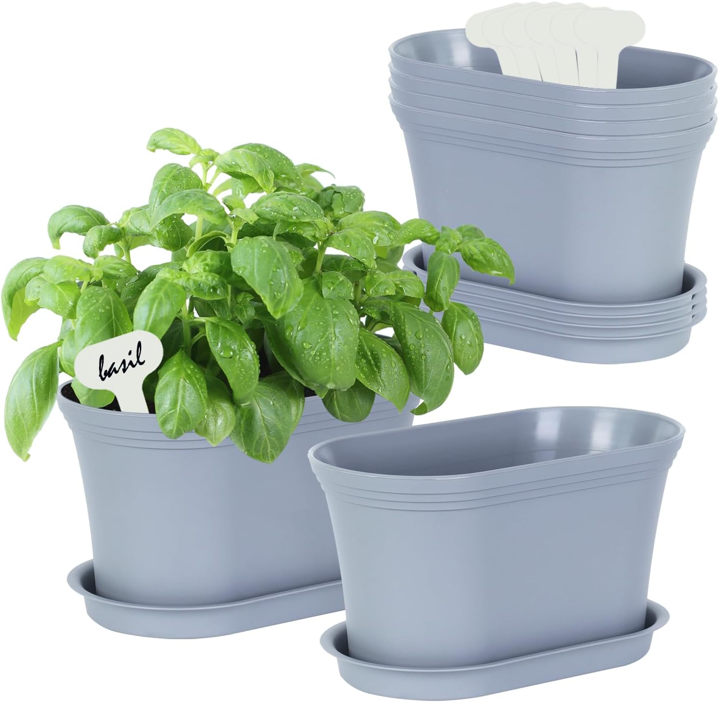 Windowsill Herb Garden Planter with Tray, Set of 6 Grey Oval Farmhouse Garden Pots for Indoor/Outdoor Plants (No Seeds)