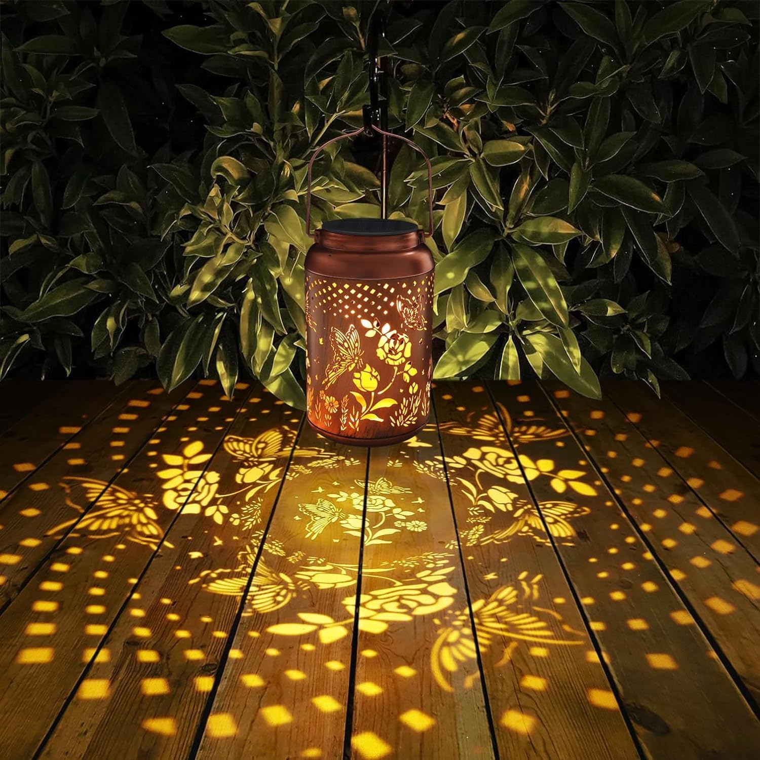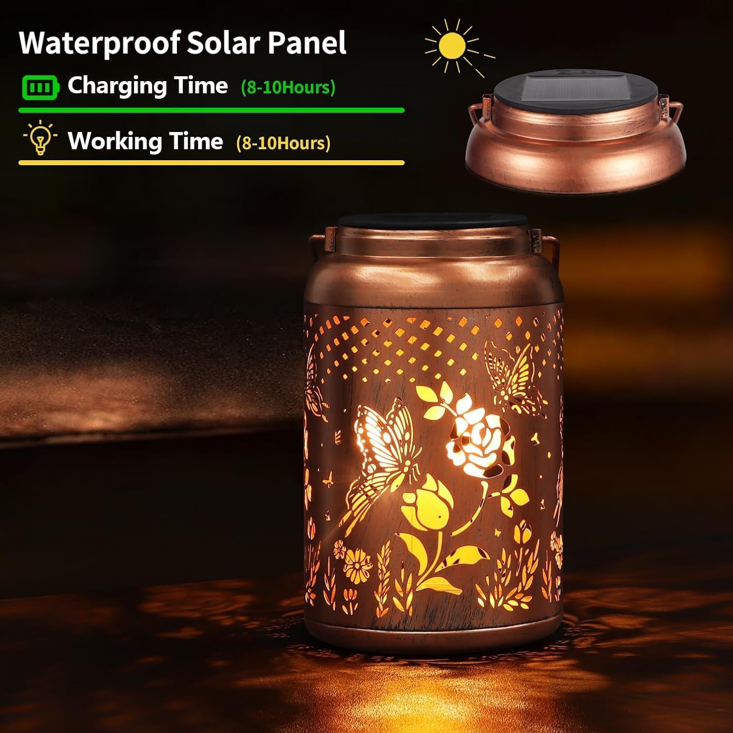 • Graceful Decorative Design:The retro appearance, with gold copper color and hollow out metal veneer, the solar outdoor lanterns casts bright and warm light in darkness, accompanied by gorgeous and graceful butterfly rose patterns, adding a beautiful atmosphere to the surrounding environment.
