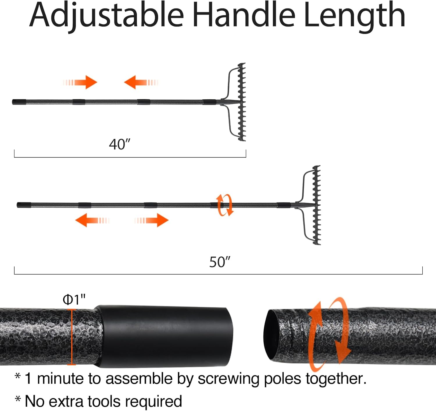 • Sturdy 1" diameter metal rake for rocks with rustproof&skidproof old school polish and paint spraying is stronger for heavy yard duty without snaps.