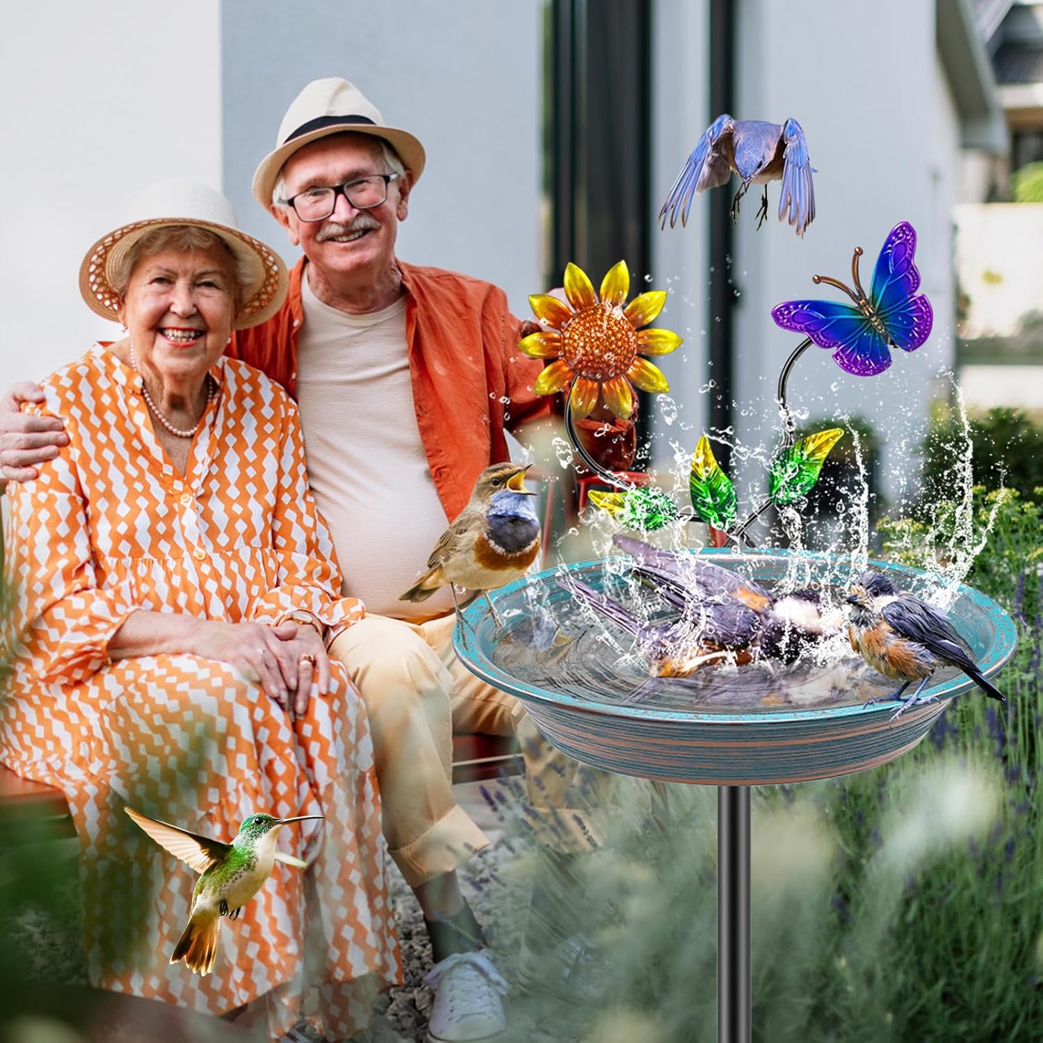 • Beautiful Garden Decor:The metal bird bath adds removable sunflower and butterfly decor for added beauty. The vintage finish coating allows the birdbath to display a silky, beautiful metallic sheen when exposed to sunlight. Add an extra splash of beautiful color to your garden