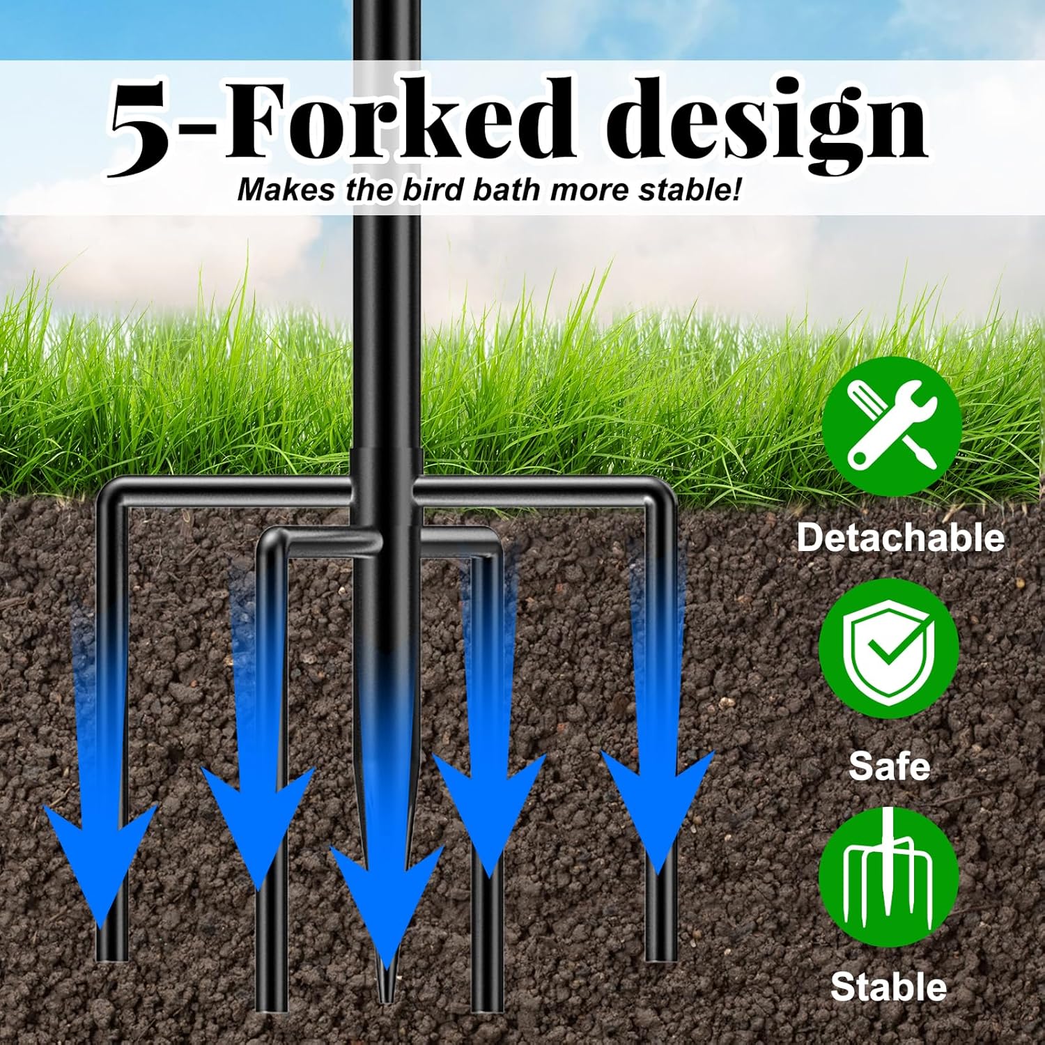 • Sturdy and Durable:The metal bird feeder made of 5-prong base allows the birdbath to be firmly fixed in the soil of your yard, you don't have to worry about the birdbath tipping over in bad weather. Made of excellent material, it is hard to bend, not easily rusted