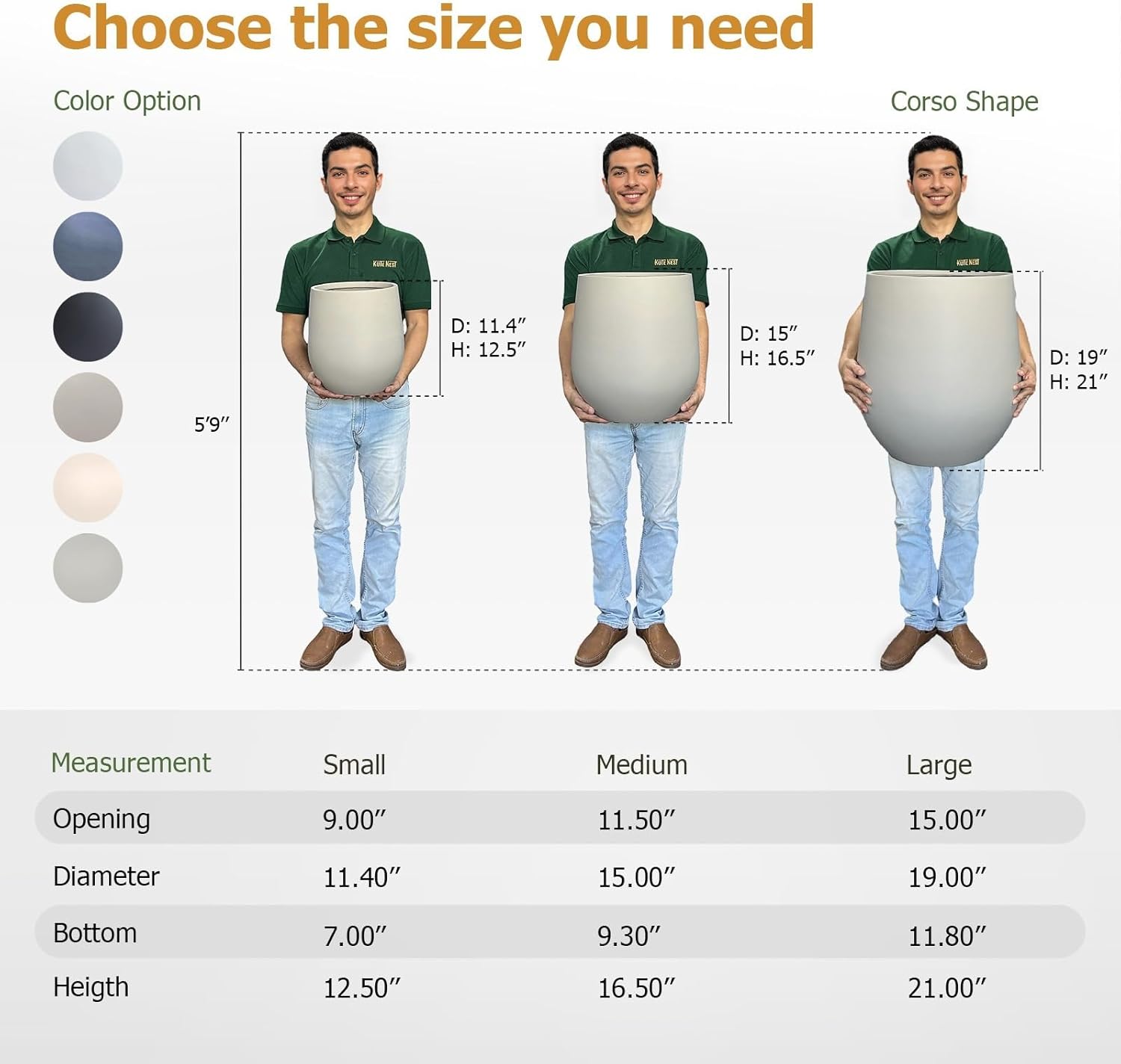 • Small Planter: 11.4"D x 12.5"H (9" Pot Opening)
