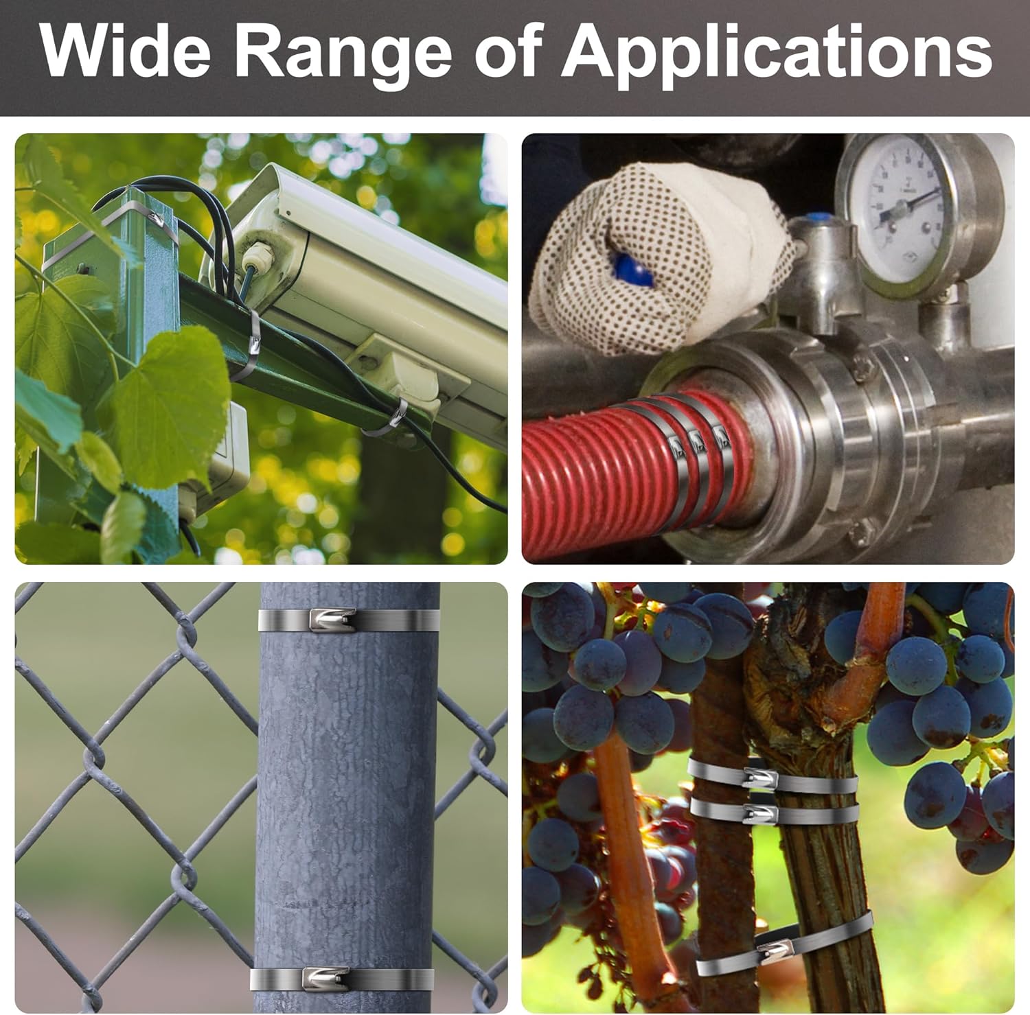 • Versatility: As a repair and fastening tool, Foneso metal cable ties are suitable for use in various settings such as mechanical equipment, vehicles, farm gardens, and more. They are commonly used for securing wire mesh, fence kit, fence T post clips, constructing chicken coops and pet cages, bundling cable conduits, exhaust heat wraps, and more